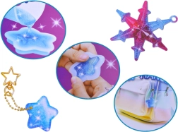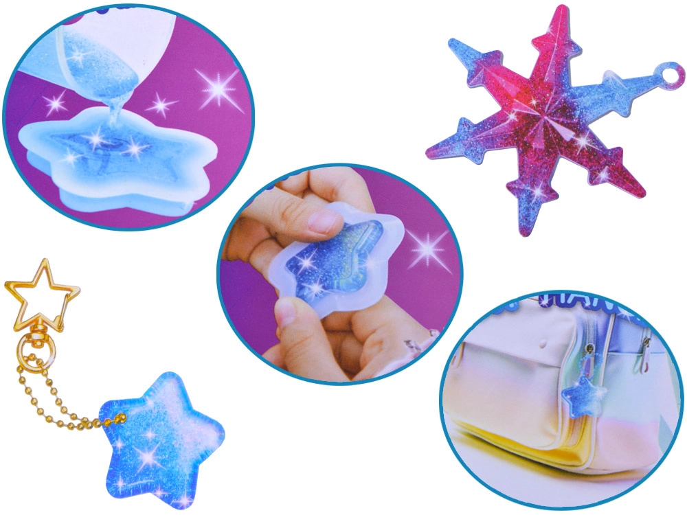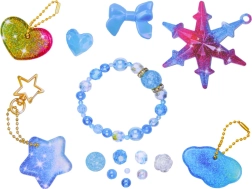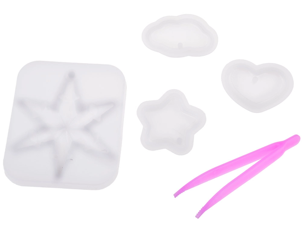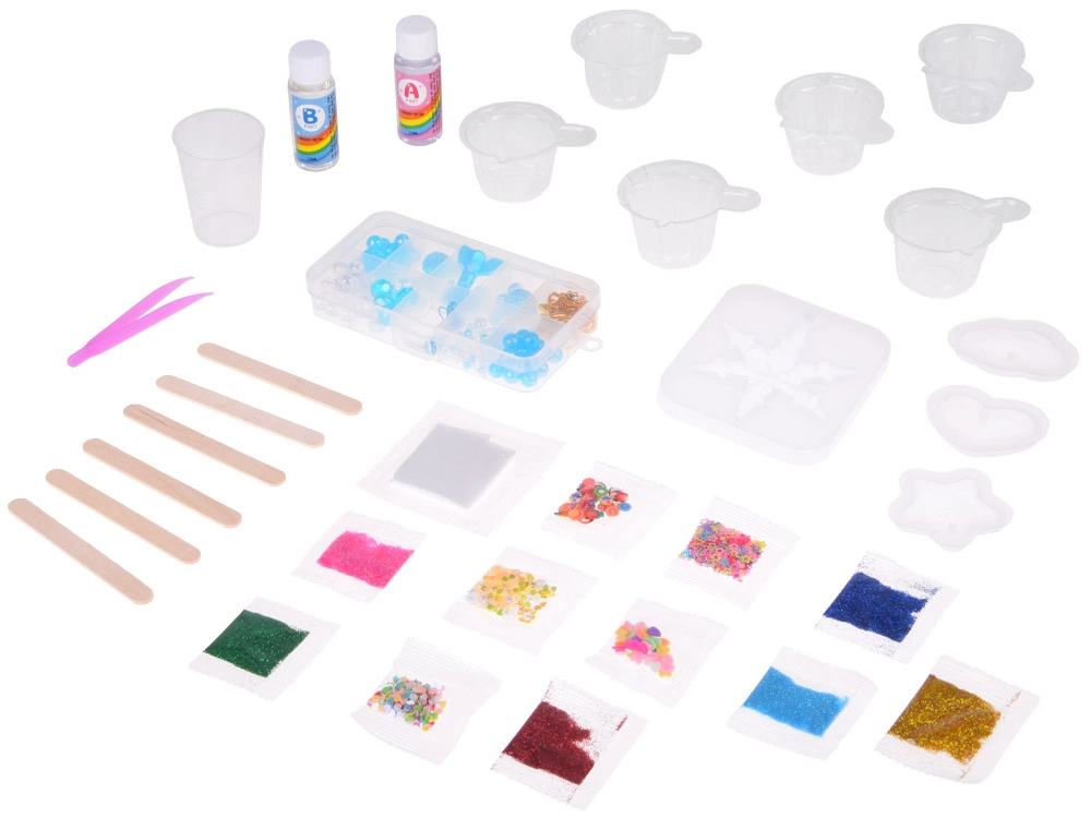 Šis radošais komplekts ļauj viegli liet kristāldzidrus sveķu rotājumus iemīļotās formās – zvaigzne, mākonis vai sirds. Sajauciet A un B komponentus attiecībā 1:1, pievienojiet spīdumus vai krāsainas konfeti, ielejiet silikona formās un pēc sacietēšanas pievienojiet metāla riņķīšus, ķēdītes un krelles. Pateicoties praktiskajam organizētājam, visas sastāvdaļas būs sakārtotas un pa rokai.