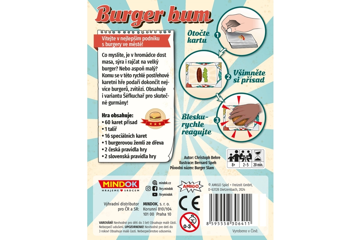 Kļūstiet par ātrās burgeru kārtošanas meistaru dinamiskajā kāršu spēlē Burger Bum. Kārtojiet sastāvdaļas uz šķīvja, pareizi atminiet, kad burgers ir gatavs, un īstajā brīdī satveriet maizīti. Ātra spēle, spraigi reakcijas dueļi un izklaide visai ģimenei no 8 gadu vecuma.