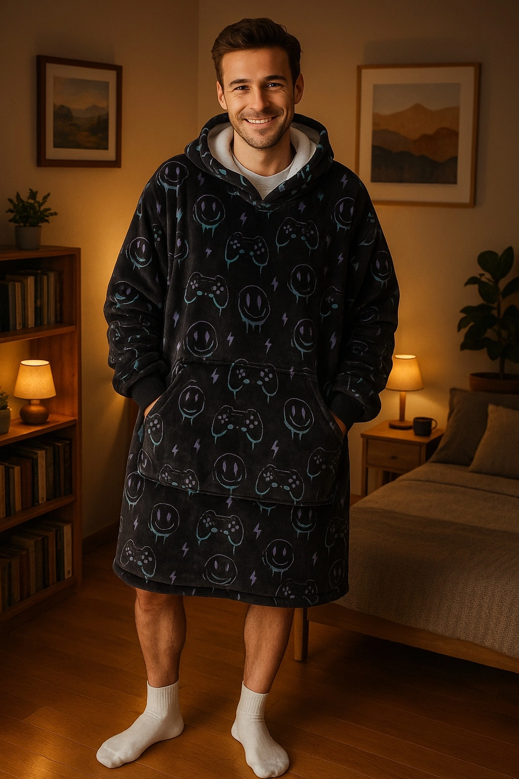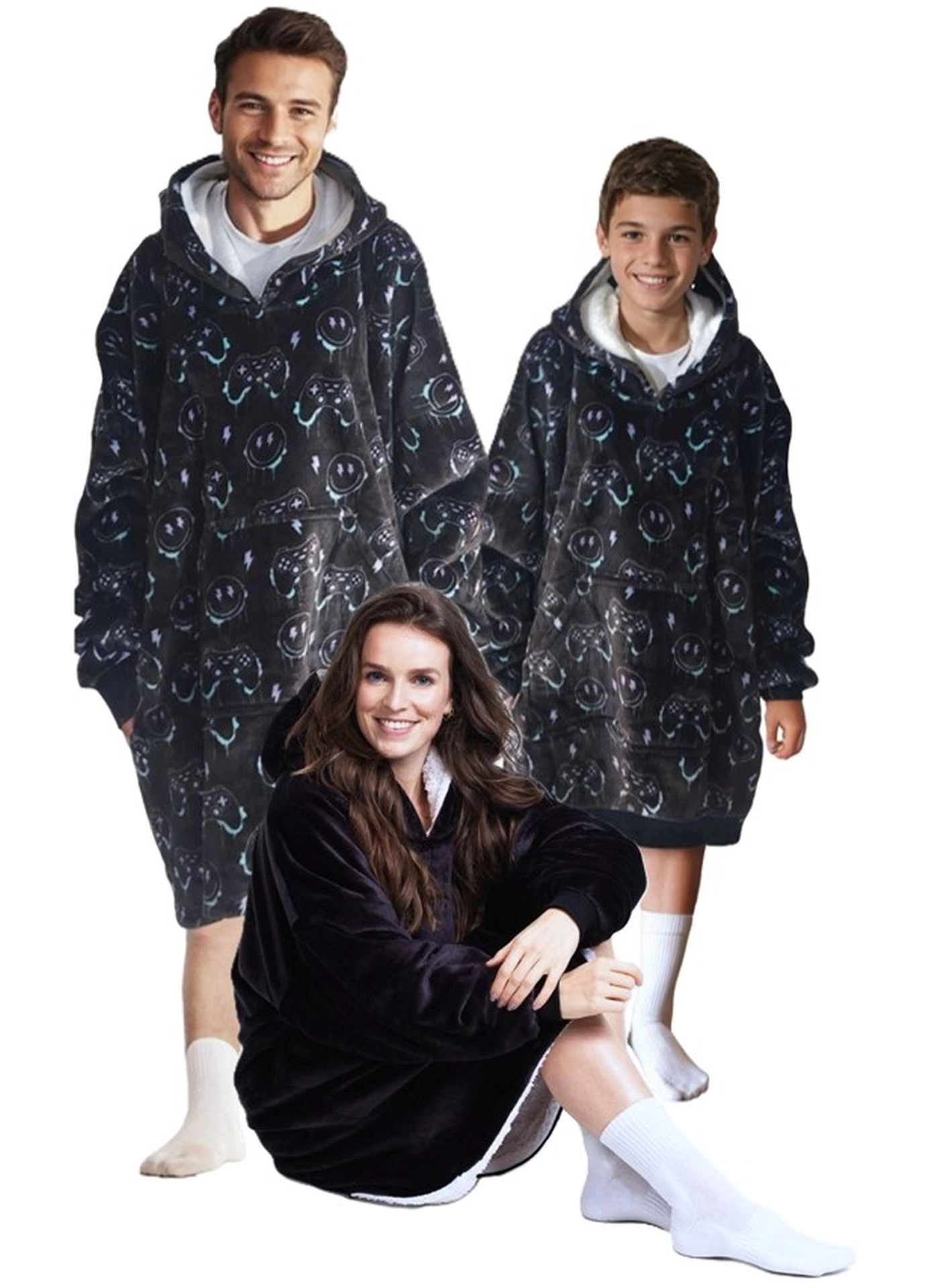 Sildošā kapučdeka ar spēļu apdruku radīta atpūtas brīžiem. Ārpuses flanelis ir patīkami maigs pieskārienam, bet iekšējais šerpas flīsa slānis nodrošina pūkainu siltumu bez lieka svara. Universālais oversize piegriezums neierobežo kustības un lieliski der gan pusaudžiem, gan pieaugušajiem.