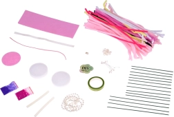 Kas iekļauts komplektā: krāsaini radošie stieplīši, dekoratīvie elementi (pērlītes, lentes), krāsains pulveris, filcs, sūklītis, līmlente, līmes kociņš (papildaprīkojums – nav obligāti jāizmanto) un attēlots instrukciju ceļvedis.