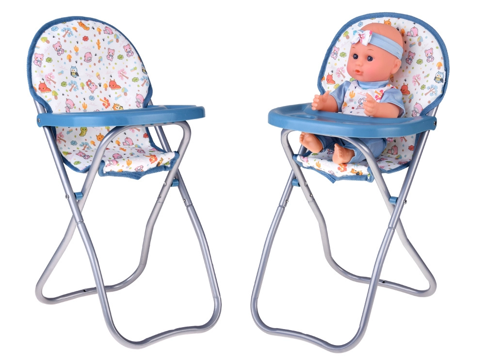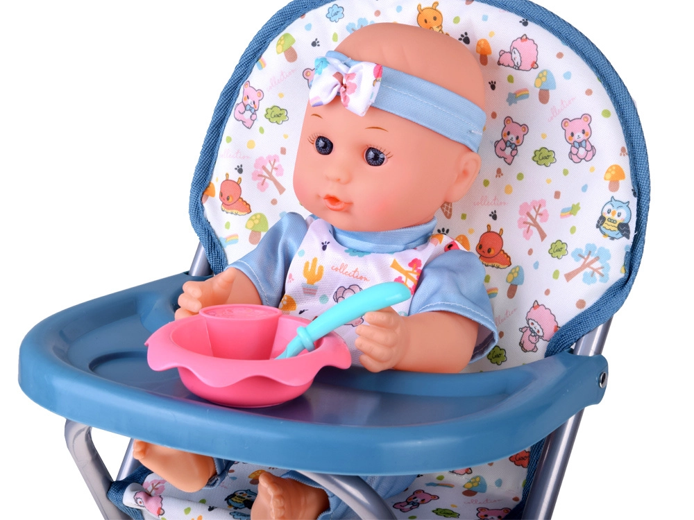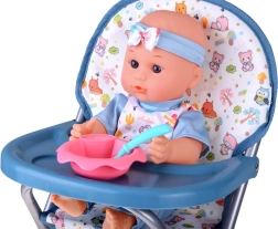 Stabils saliekams krēsliņš ar paplāti un vietu bļodiņai un galda piederumiem. Atbalsta realistisku barošanas un maltītes spēli ar lelli.