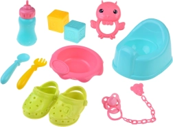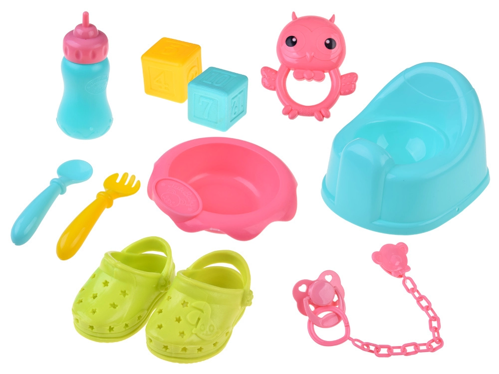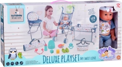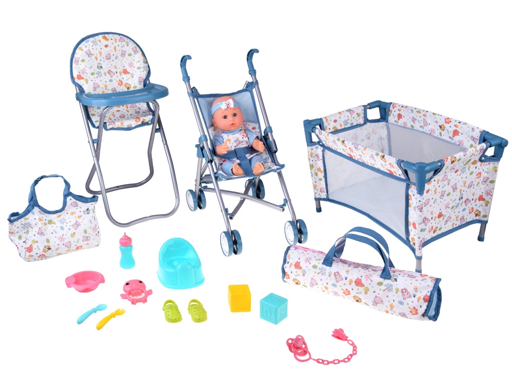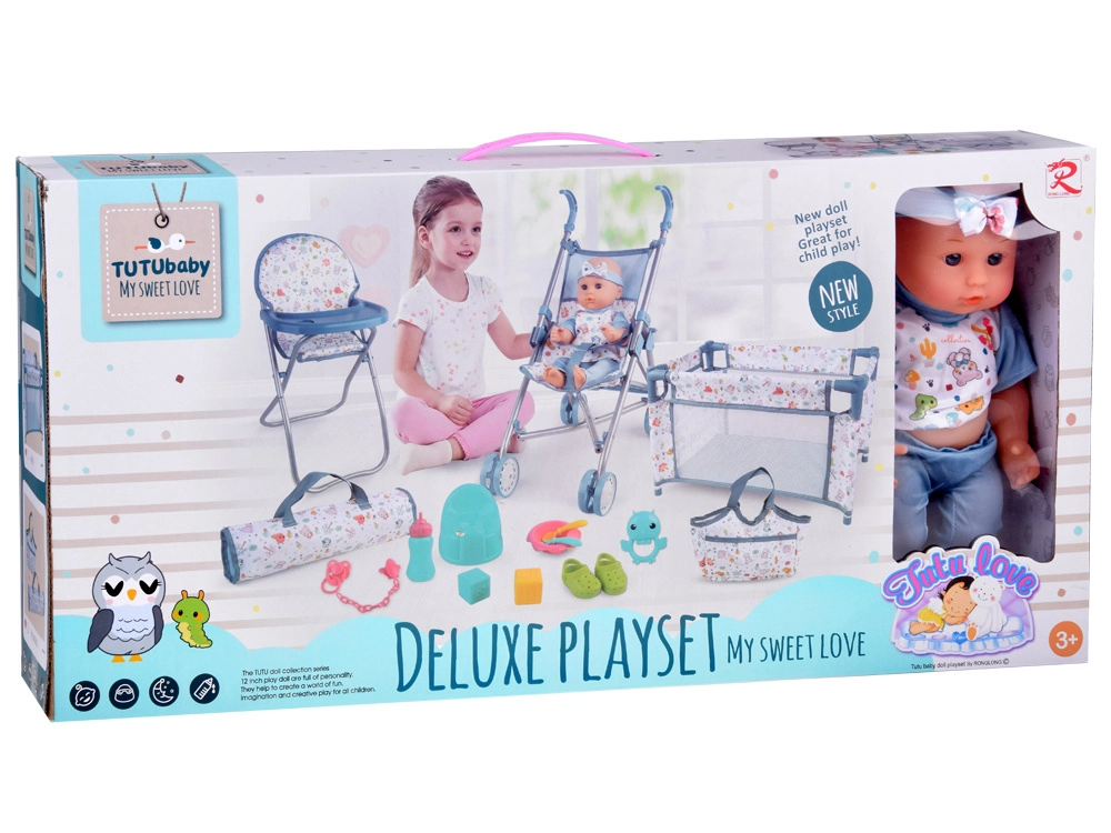 Praktiskais aprīkojums ietver ēdināšanas komplektu (bļodiņu, galda piederumus un pudelīti), podiņu, knupīti ar ķēdīti, krāsainus klucīšus un grabuli. Ceļojumu gultiņa ar elpojošiem tīklotiem sāniem un somu ir ideāla gan rotaļām, gan glabāšanai. Pateicoties bagātīgajam piederumu klāstam, bērni viegli atdarina īstu mazuļa aprūpi un attīsta komunikāciju un sīko motoriku.
