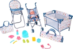 Pilns rotaļu komplekts mazajiem aprūpētājiem: mīļa lelle mazulis ar bagātīgu aprīkojumu barošanai, pārsiešanai, gulēšanai un pastaigām. Komplektā ir saliekami ratiņi, barošanas krēsliņš, ceļojumu gultiņa ar somu, podiņš, pudelīte, bļodiņa ar karotīti un dakšiņu, knupītis uz ķēdītes, rotaļlietas un kurpītes. Šis komplekts attīsta empātiju, radošumu un lomu spēļu prasmes un piedāvā daudzas stundas jautrības mājās un ceļā.