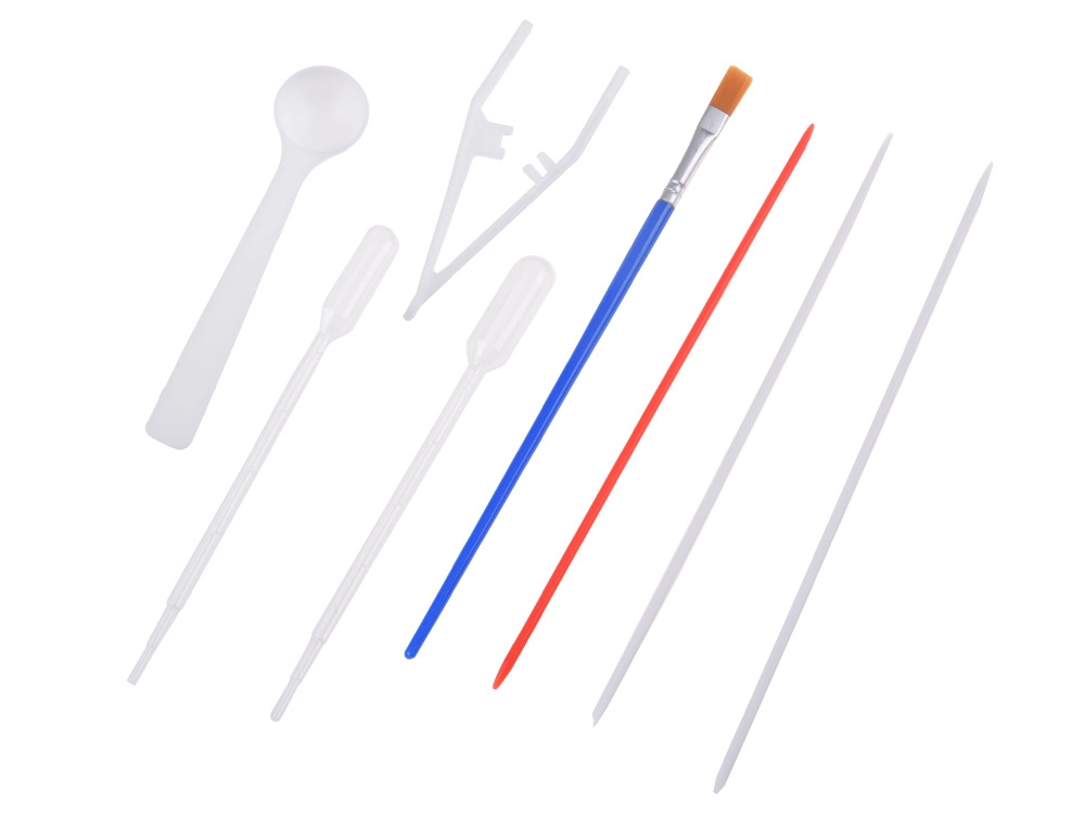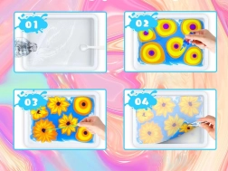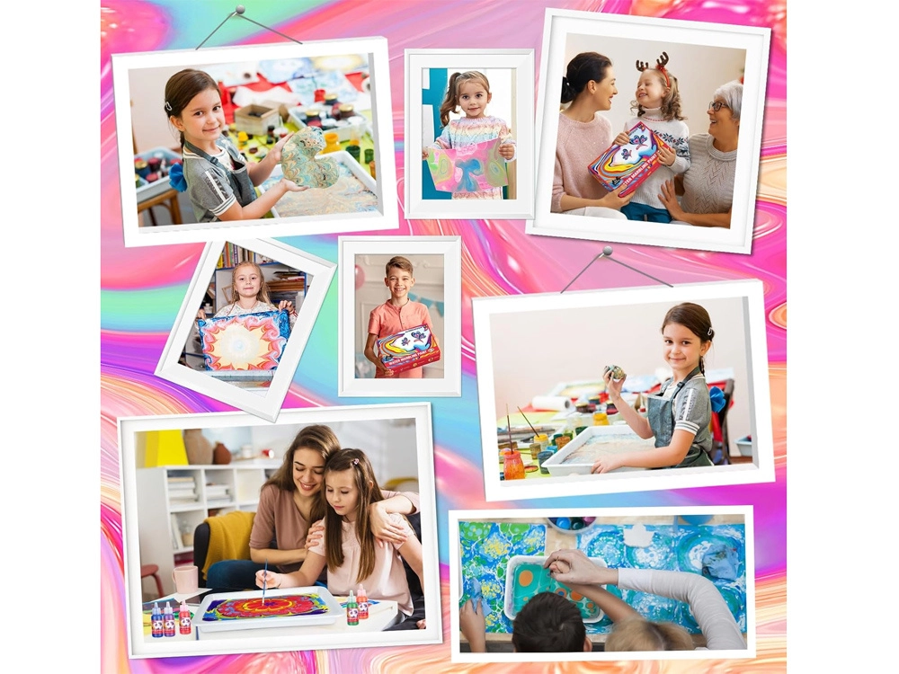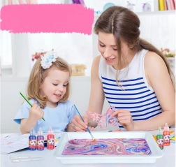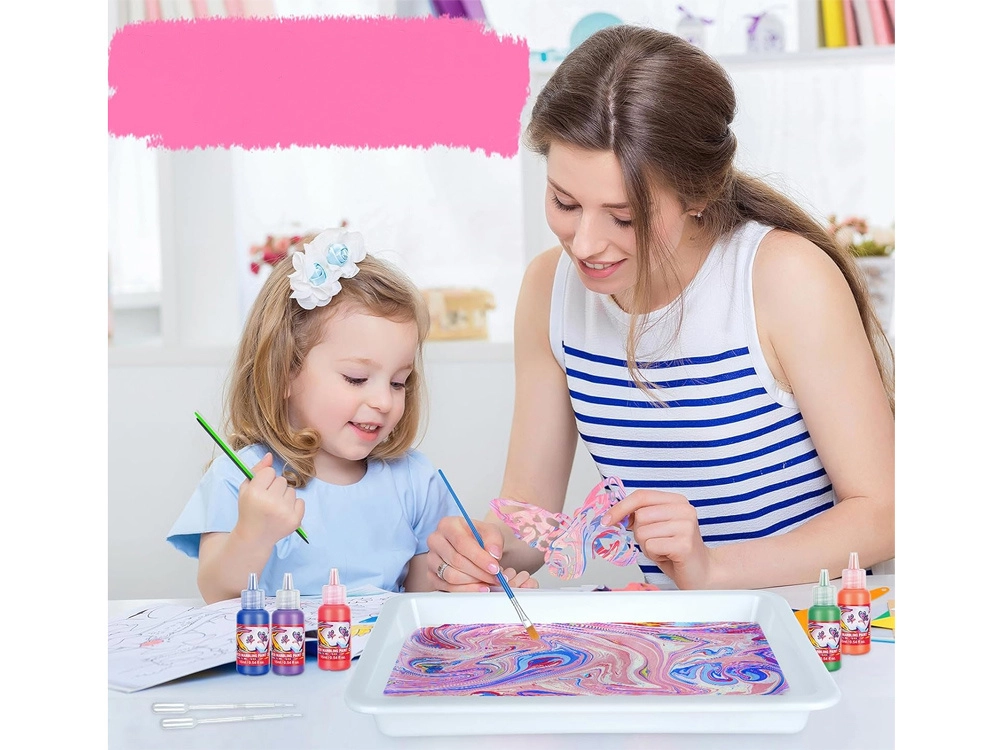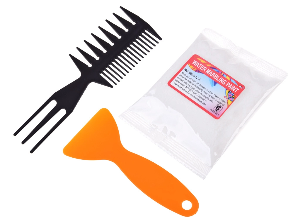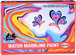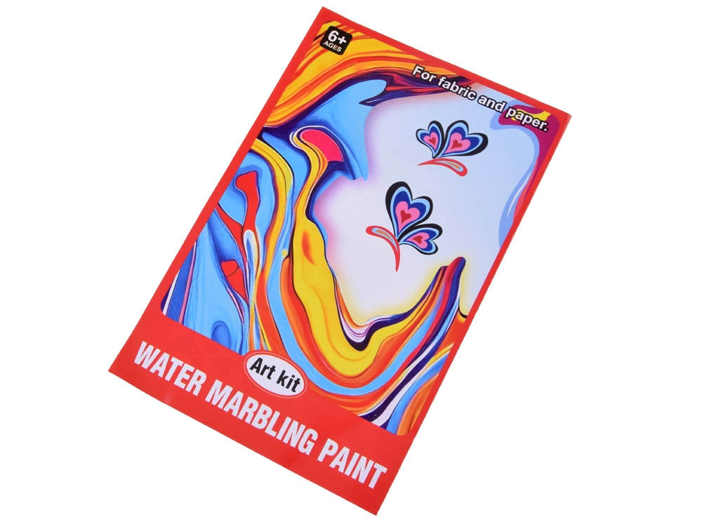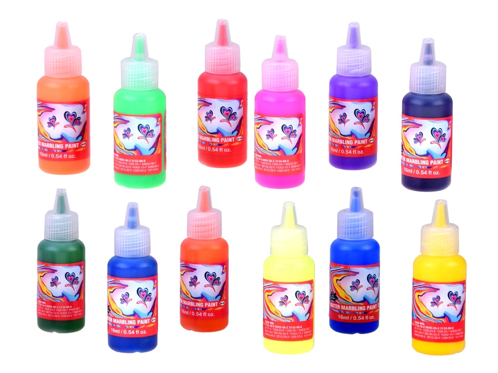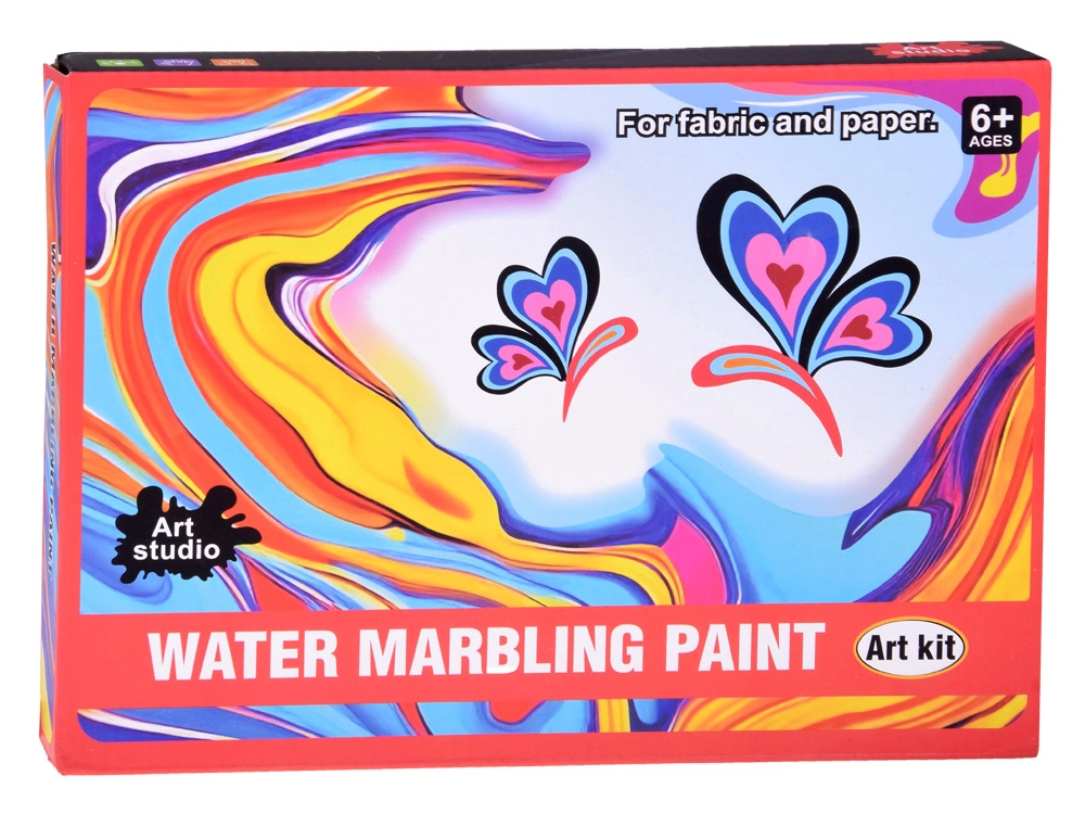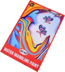 Iepakojumā atradīsiet visu nepieciešamo: 12 krāsu pudelītes (16 ml) ar precīzu uzgali, plastmasas vanniņu, papīrus un rīku komplektu (pilināmie, ķemme, ota, lāpstiņa u.c.). Sajaucot pulveri ar ūdeni, izveidosiet gēlveida vannu, kurā pilināsiet krāsas un modelēsiet rakstu – to pēc tam vienkārši pārnesīsiet uz papīru.
