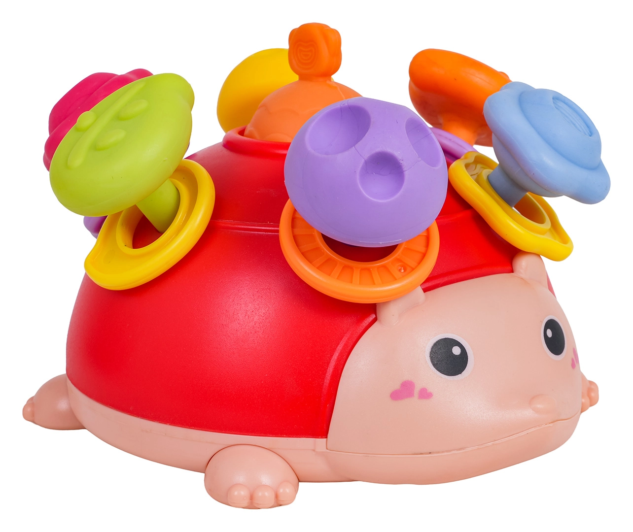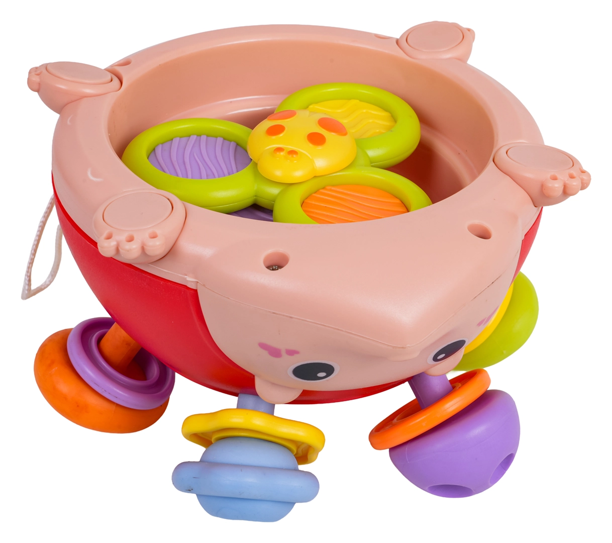 Pateicoties pārdomātai konstrukcijai bez asām malām un drošiem materiāliem, rotaļlieta ir ideāla ikdienas rotaļām mājās un ceļā. Jautrs, košs dizains ar mīļu sejiņu motivē bērnus patstāvīgai aktivitātei un stiprina pirkstiņus un satvērienu.