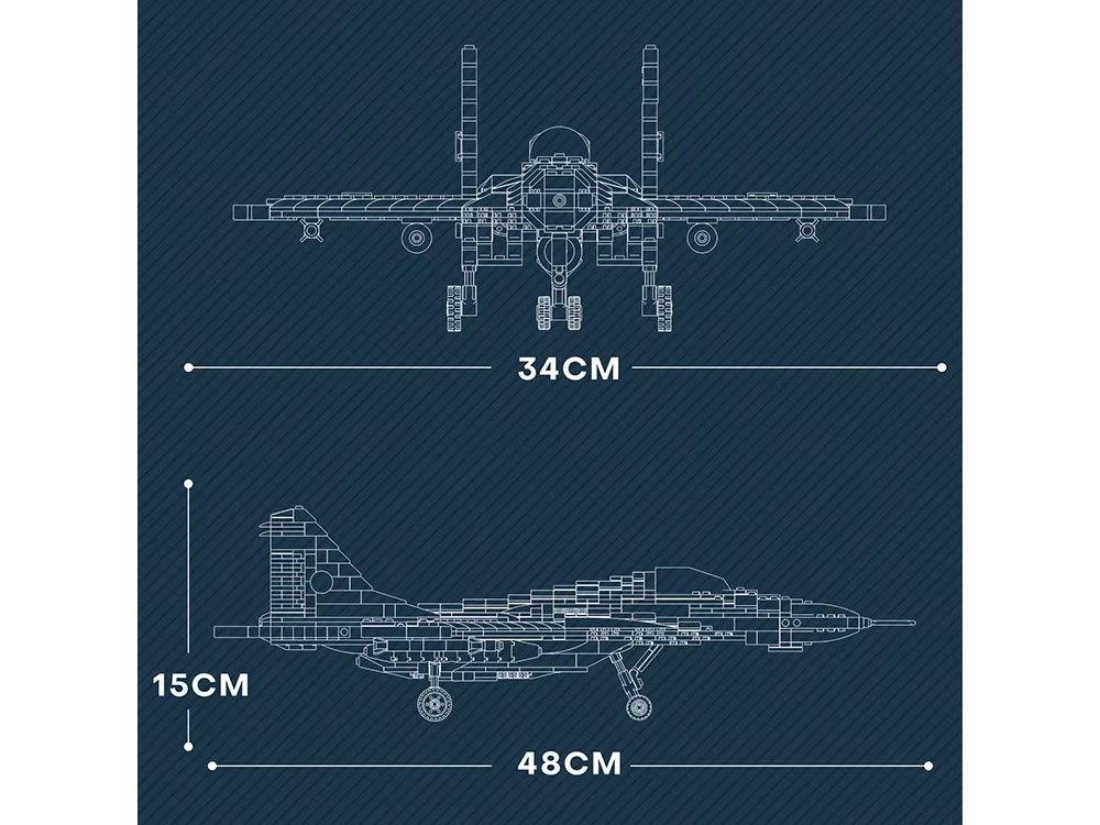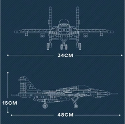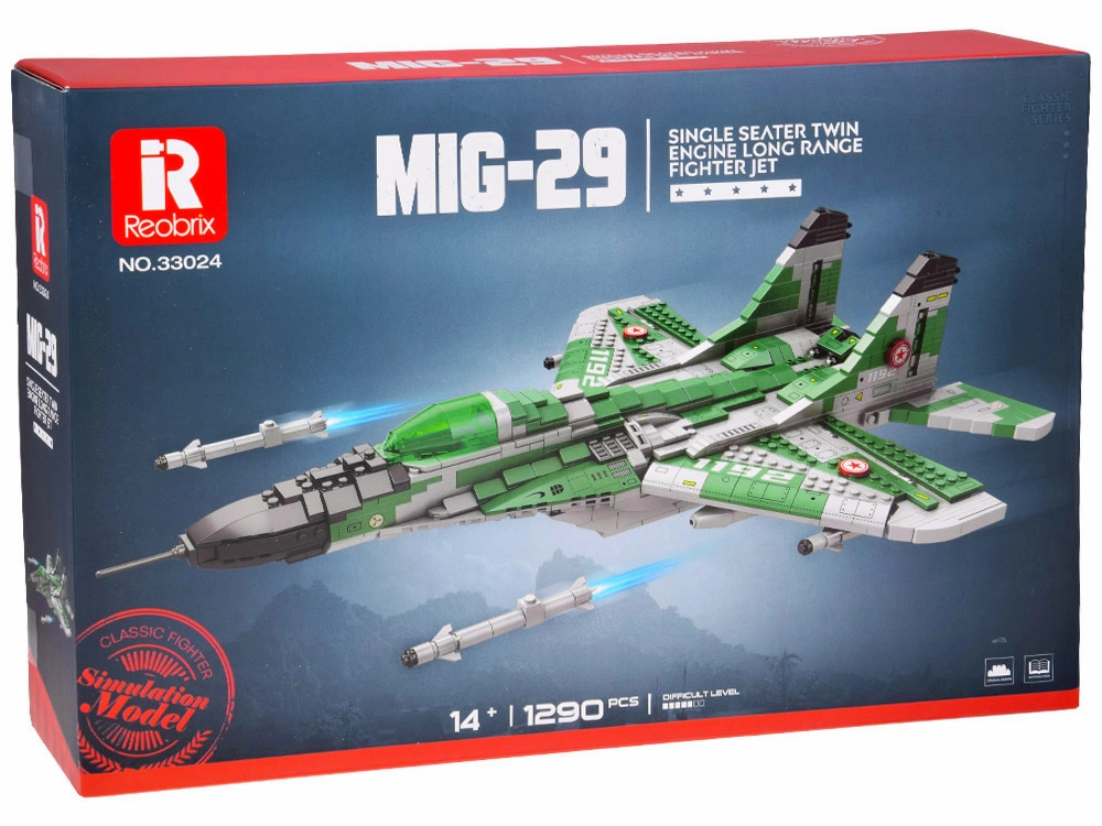 Šis detalizētais MIG‑29 modelis pelēkzaļā militārā kamuflāžas noformējumā uzticami atspoguļo raksturīgos spārnus, dubultās vertikālās astes plāksnes un reālistiskās divdzinēju gaisa ieplūdes. Pateicoties iespaidīgajiem izmēriem, tas kļūs par efektīgu eksponātu plauktā un aizraujošu konstruktoru pieredzējušākiem būvētājiem no 14 gadu vecuma.