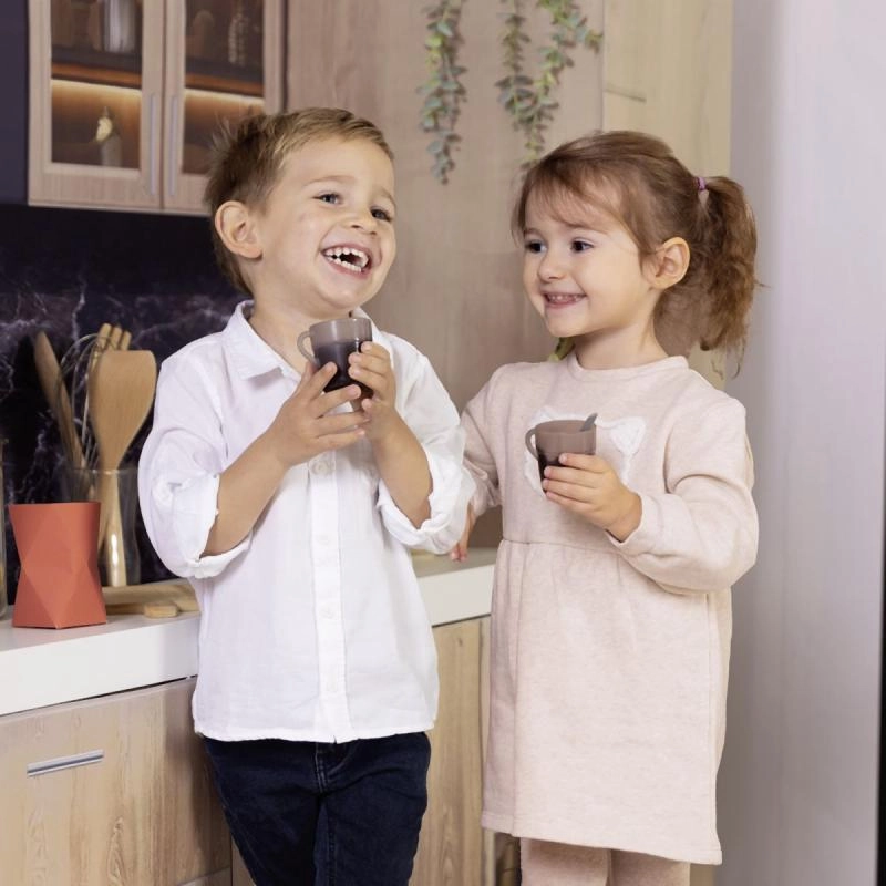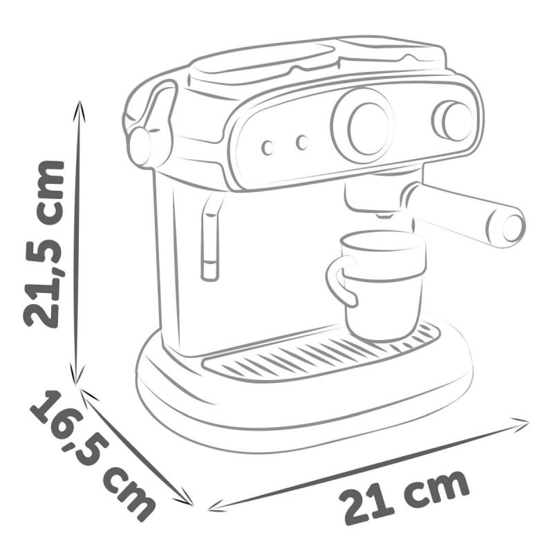 Praktiskajā komplektā ir 2 krūzītes, 2 karotītes un 2 kafijas kapsulas, tāpēc bērni var apkalpot arī draugus vai brāļus un māsas. Kompaktie izmēri 16,5 × 21 × 21,5 cm nodrošina, ka automāts iederēsies jebkurā bērnu virtuves letē.