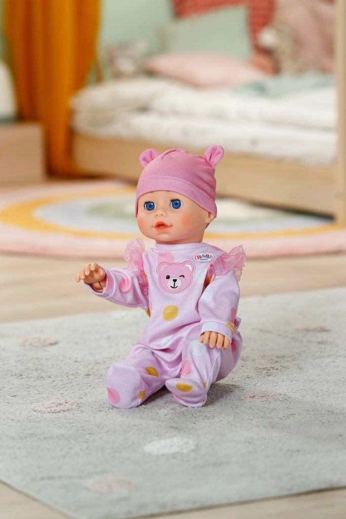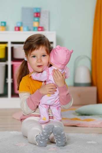 Mīksts rozā kombinezons ar punktiem un cepurīte ar austiņām piešķir spēlei maigumu.
