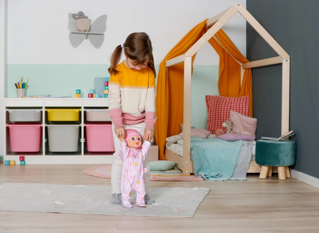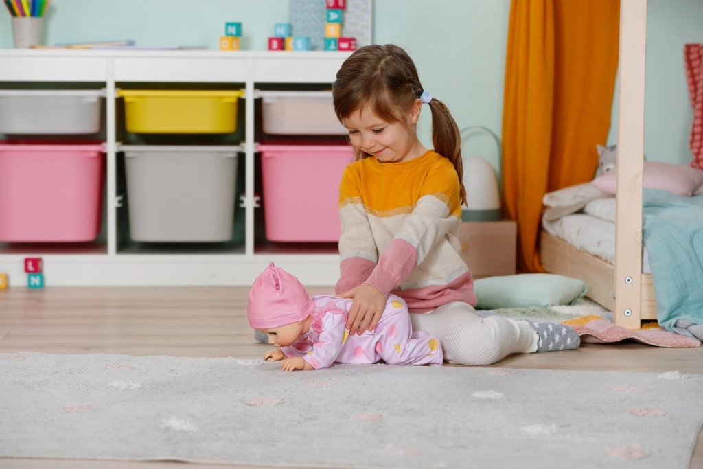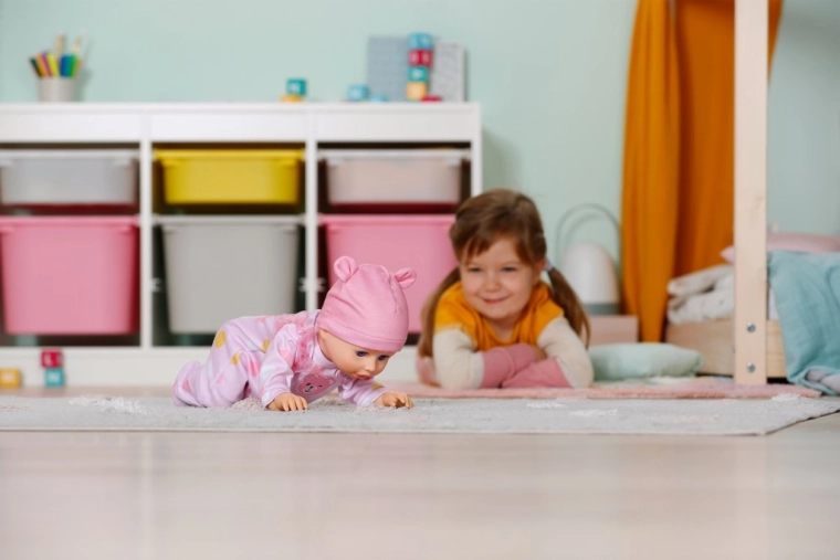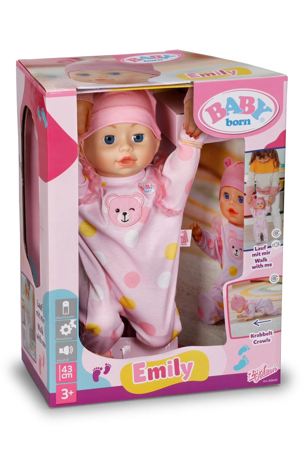 Lelle BABY born Emily iedvesmo bērnus kustēties un radīt – vienkāršs un drošs mehānisms ļauj lellei skriet uz priekšu vai rāpot pa grīdu. Bērni var atdarināt rūpes par mazuli, izdomāt stāstus un vienlaikus attīstīt gan sīko, gan rupjo motoriku.