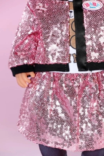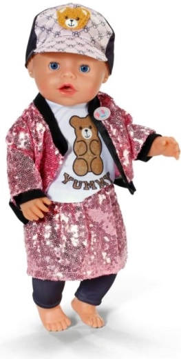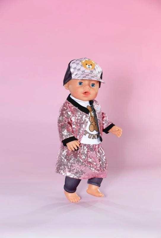 Piešķir savai lellītei vai BABY born Teddy mīlulim unikālu stilu ar šo mirdzošo apģērbu komplektu lellēm 43 cm. Komplektā ietilpst rozā fliteru jaka, svārki, krekls ar lācīša apdruku, cepure un legingi – ideāli radošai un ilgstošai spēlei. Iekļauts arī pakaramais no pārstrādāta materiāla ilgtspējīgākai spēlei.