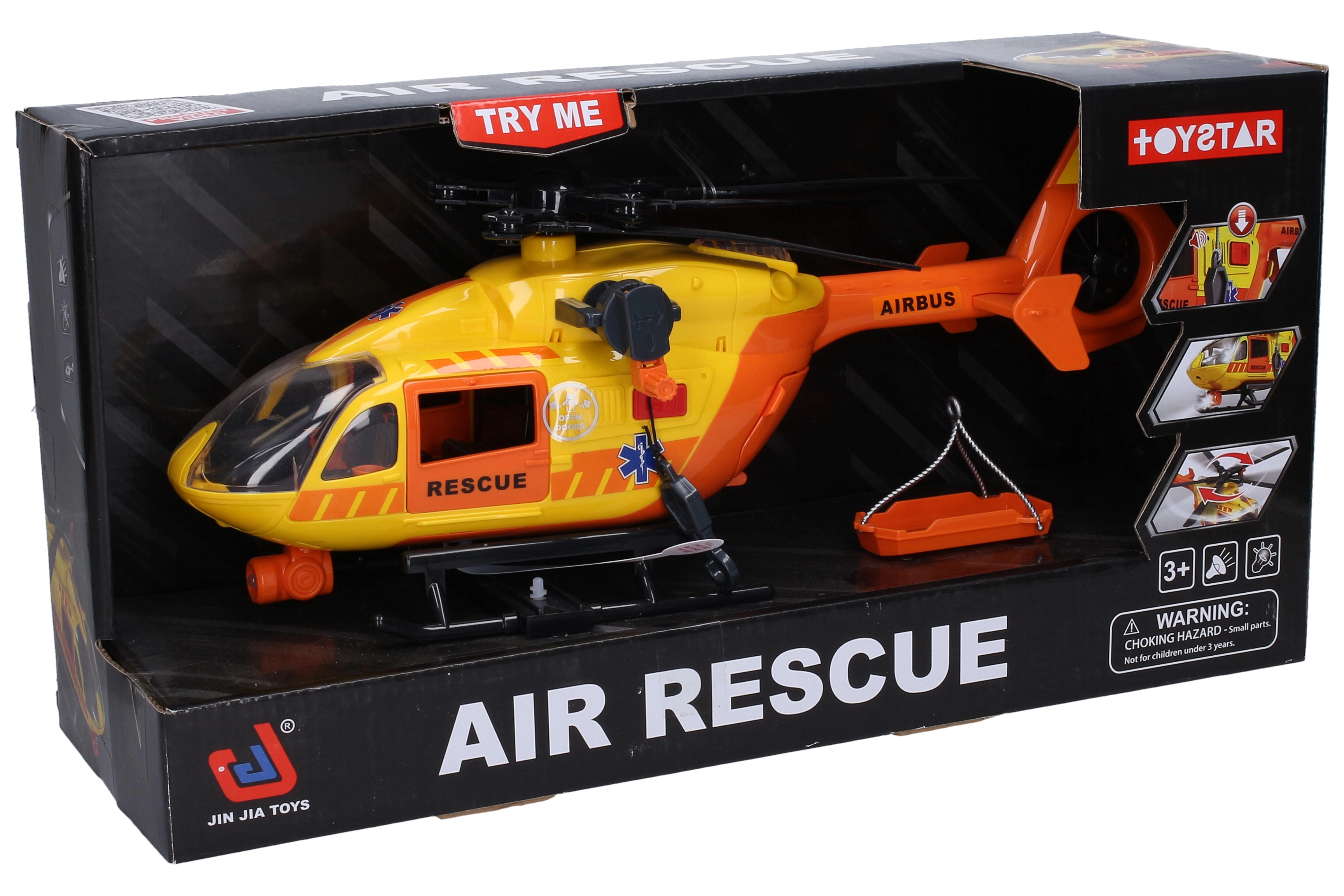 Dramatiskām glābšanas situācijām grūti pieejamās vietās kalpo izvelkama trose ar āķi, ko darbina rotējoša svira. Komplektā ir arī nestuves, kuras var piekārt pie āķa. Spēle var sākties nekavējoties – 2× AAA baterijas ir iekļautas un ievietojamas helikoptera apakšpusē.