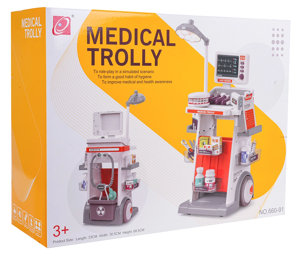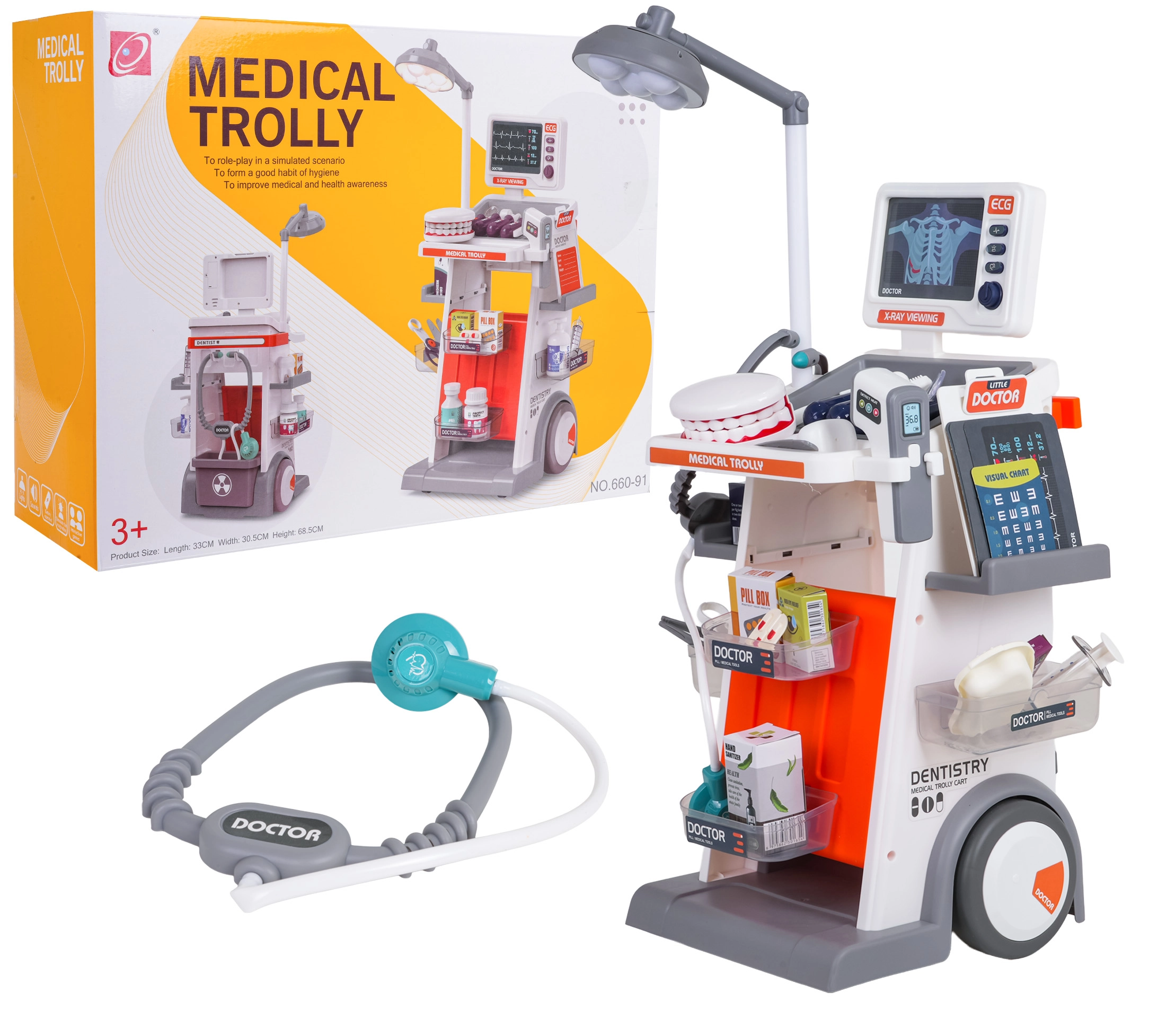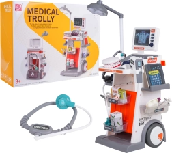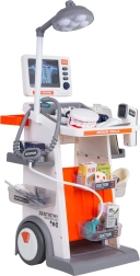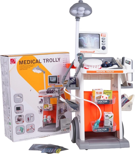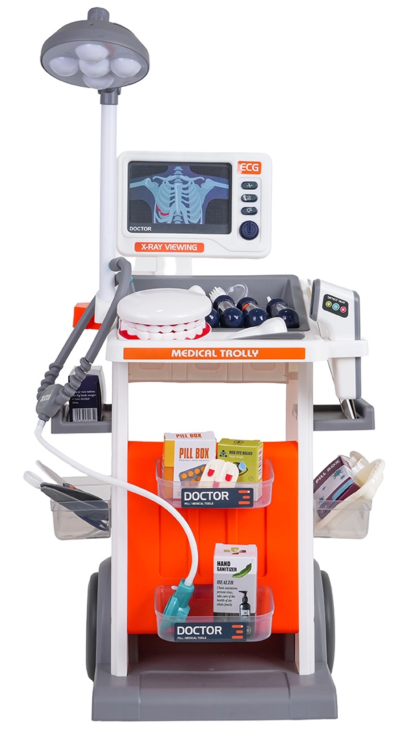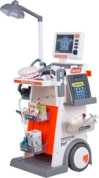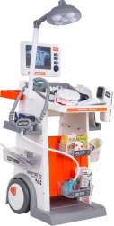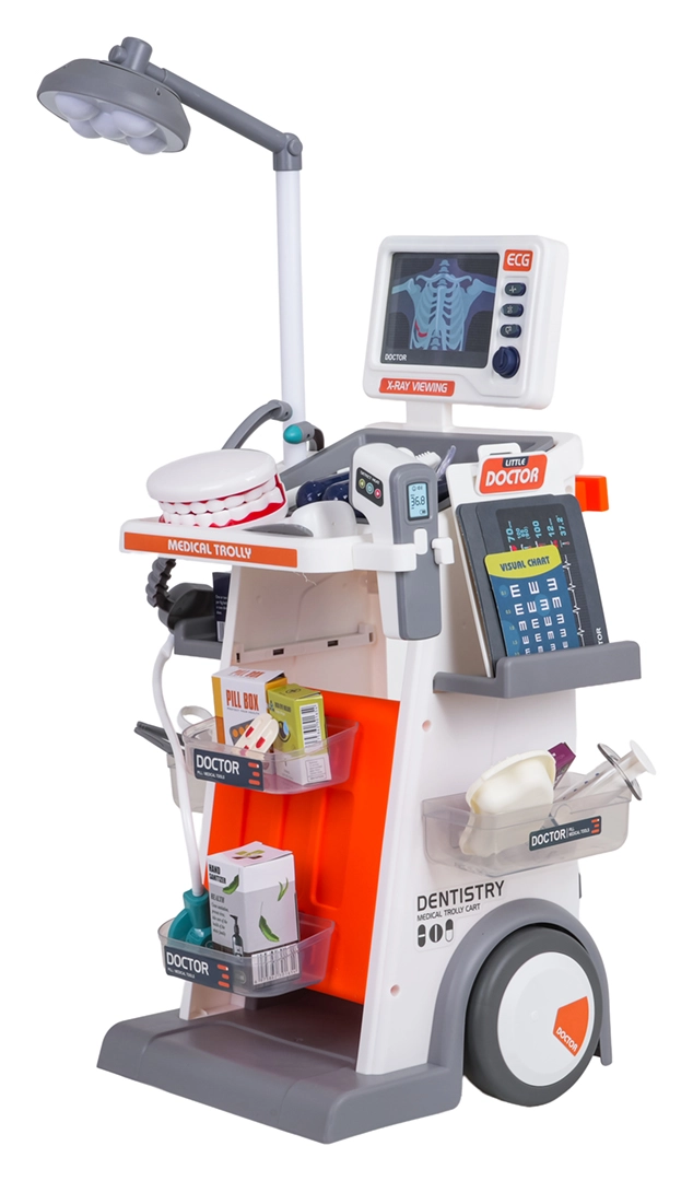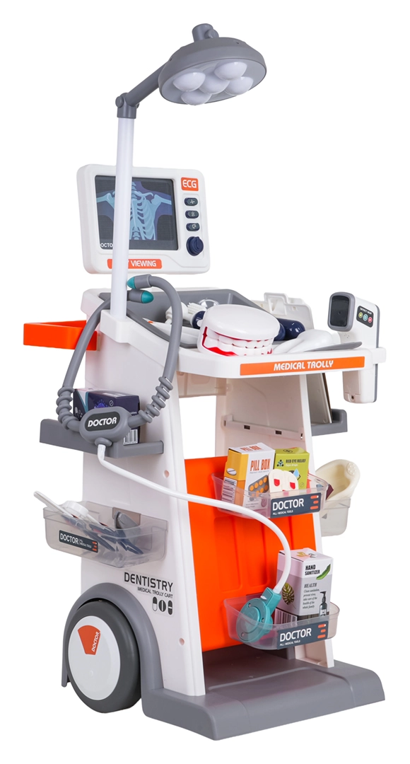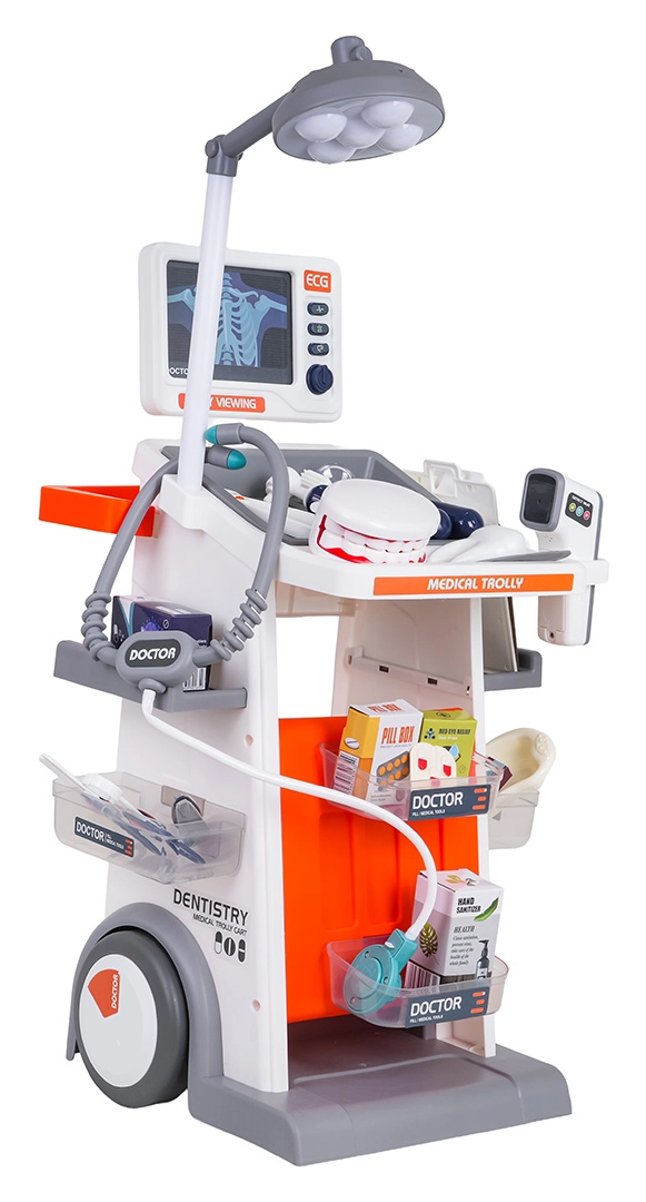 Šis bagātīgi aprīkotais komplekts apvieno ārsta, zobārsta un acu ārsta piederumus vienos mobilajos ratos. Lielie riteņi un rokturis nodrošina vieglu pārvietošanu, bet plaukti un trauciņi ietilpina visus aksesuārus. Bērni baudīs reālistisku spēli, pateicoties gaismas un skaņas efektiem – lampei, panelim ar “RTG” attēliem, apgaismotam termometram un zobārstniecības spogulītim, kā arī sirds skaņai stetoskopā.