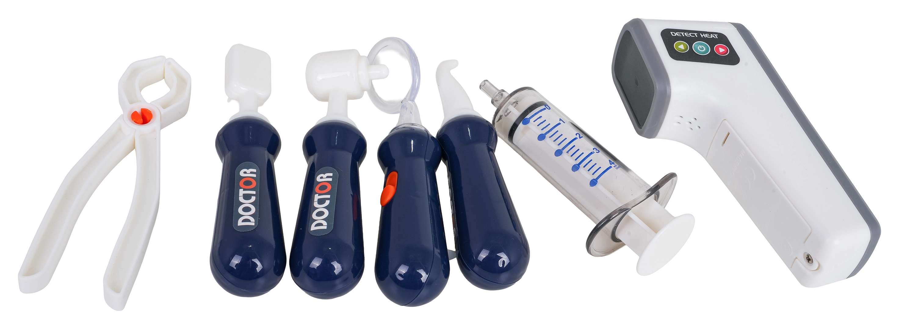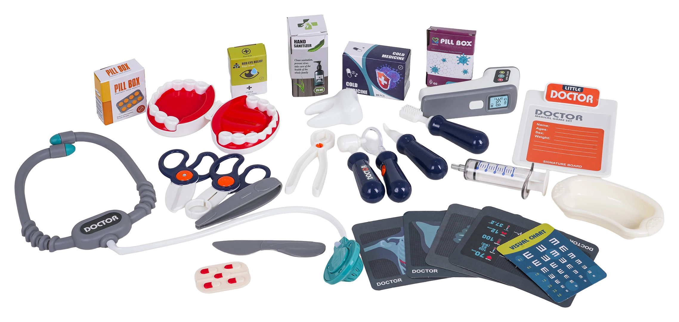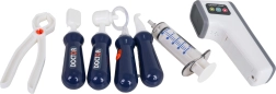Stetoskops, termometrs, šļirce, pincete, šķēres, zobārstniecības instrumenti, “rentgena” kartes, zobu modelis, pacienta karte un citi piederumi.