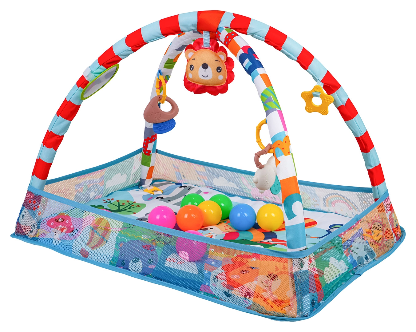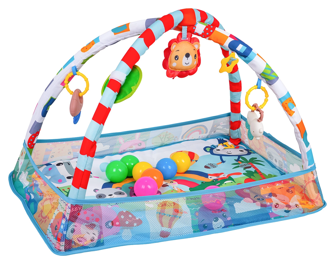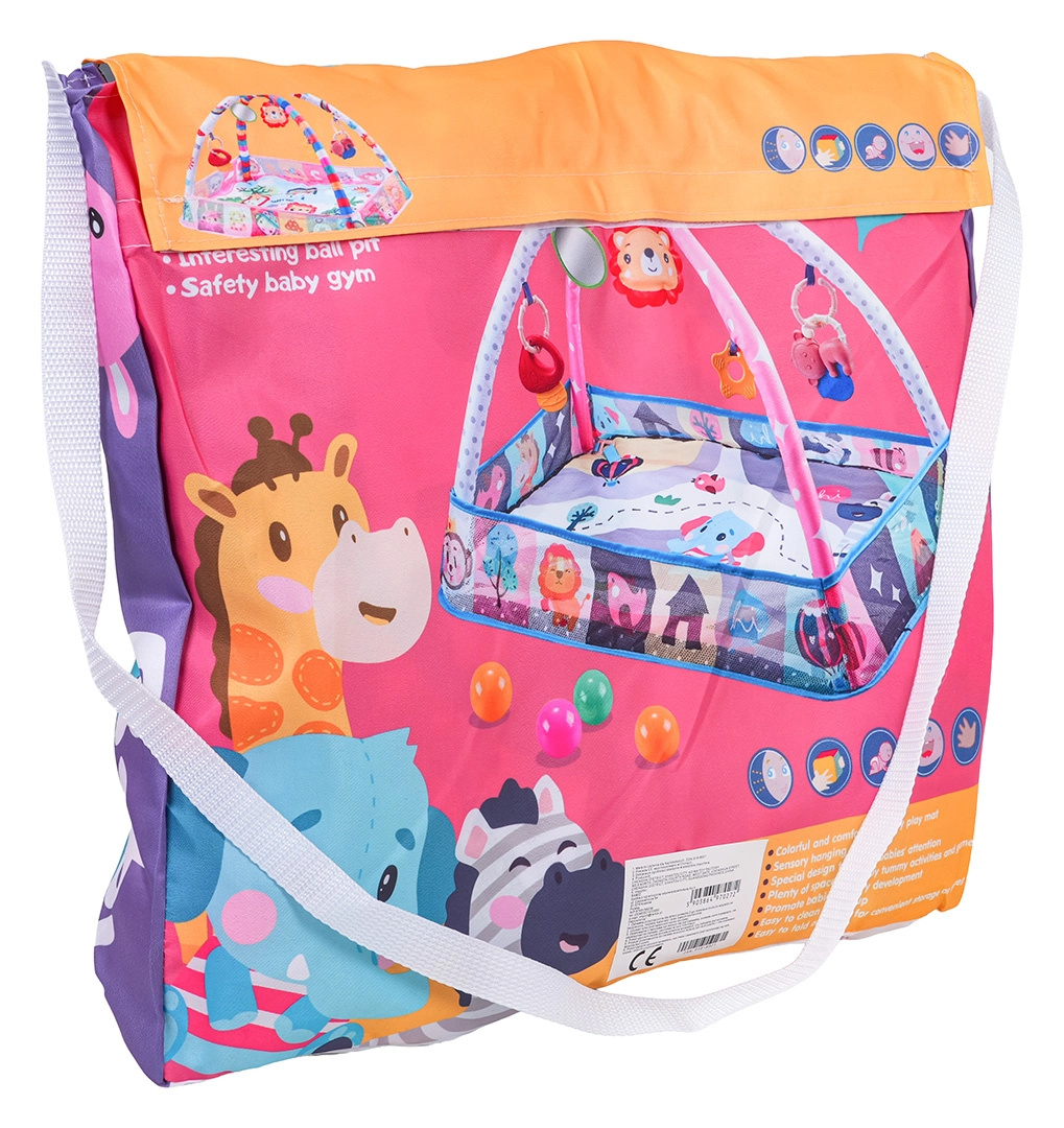 Komplektācijā: paklājiņš ar piekaramām rotaļlietām, 8× plastmasas bumbiņas sausajam baseinam un krāsaina pleca soma ērtai pārnēsāšanai un glabāšanai.