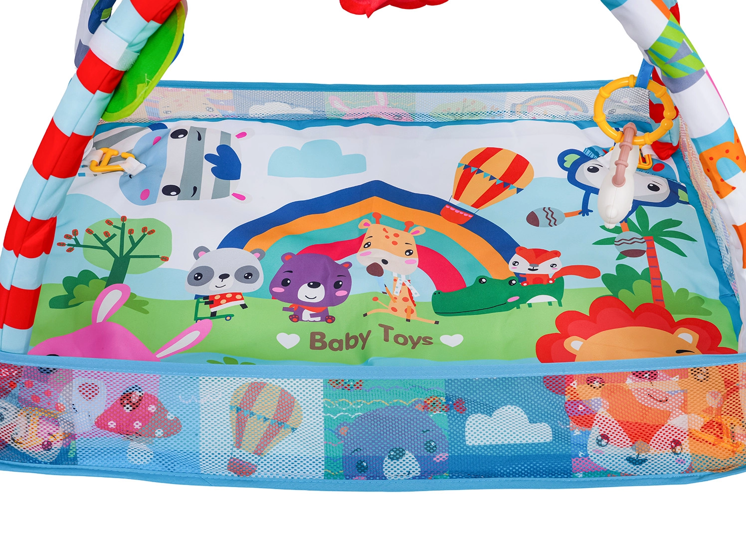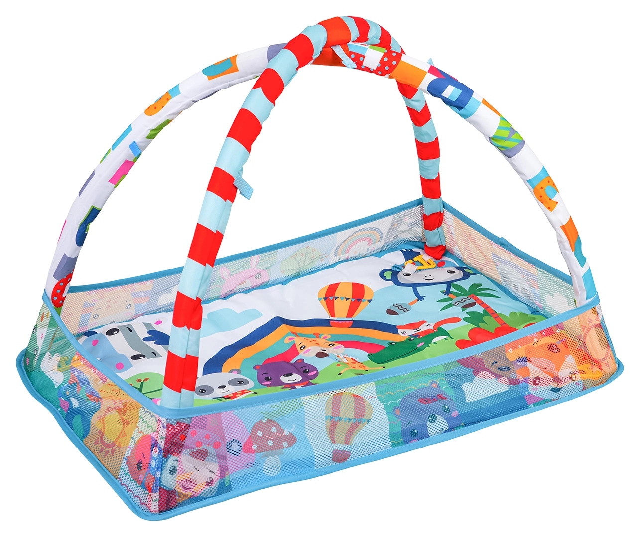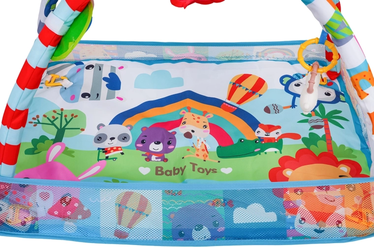 Komplektācijā: paklājiņš ar piekaramām rotaļlietām, 8× plastmasas bumbiņas sausajam baseinam un krāsaina pleca soma ērtai pārnēsāšanai un glabāšanai.