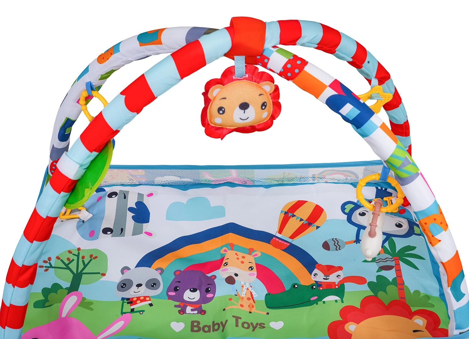 Noņemamā arka ar piekaramām rotaļlietām (drošs spogulītis, rotaļlietas ar grabulīšiem un graužekļiem, plīša lauva ar pīkstuli u.c.) mudina bērnu stiepties, satvert un atklāt. Paklājiņš izgatavots no drošiem, viegli kopjamiem materiāliem, tam ir dzīvas krāsas un stabila konstrukcija ikdienas rotaļām.