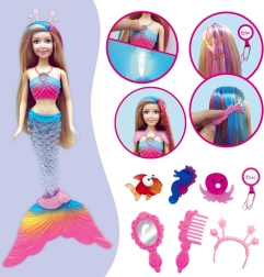 Komplektā ir bagātīgs aksesuāru klāsts – birste, ķemme, spogulītis un kronīši –, kas veicina sīkās motorikas, radošuma un maņu attīstību. Lelle ir lieliska izvēle bērniem, kuri mīl pasakas, krāsas un burvīgu atmosfēru.
