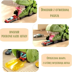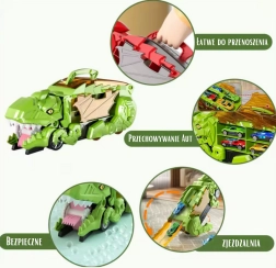 Atklājiet dinozauru un sacīkšu auto pasauli vienā! Šis dinozaura kravas auto ar rampu no WOOPIE kalpo kā pārnēsājams koferītis ar rokturi, glabātuve un sacīkšu trase. Iekšpusē atradīsiet 12 metāla mašīnītes, kuras var palaist pa saliekamo nobrauciena rampu. Atverama mute, kustīgas daļas un izturīgi, droši materiāli nodrošina stundām ilgu radošu izklaidi mājās un ceļā.
