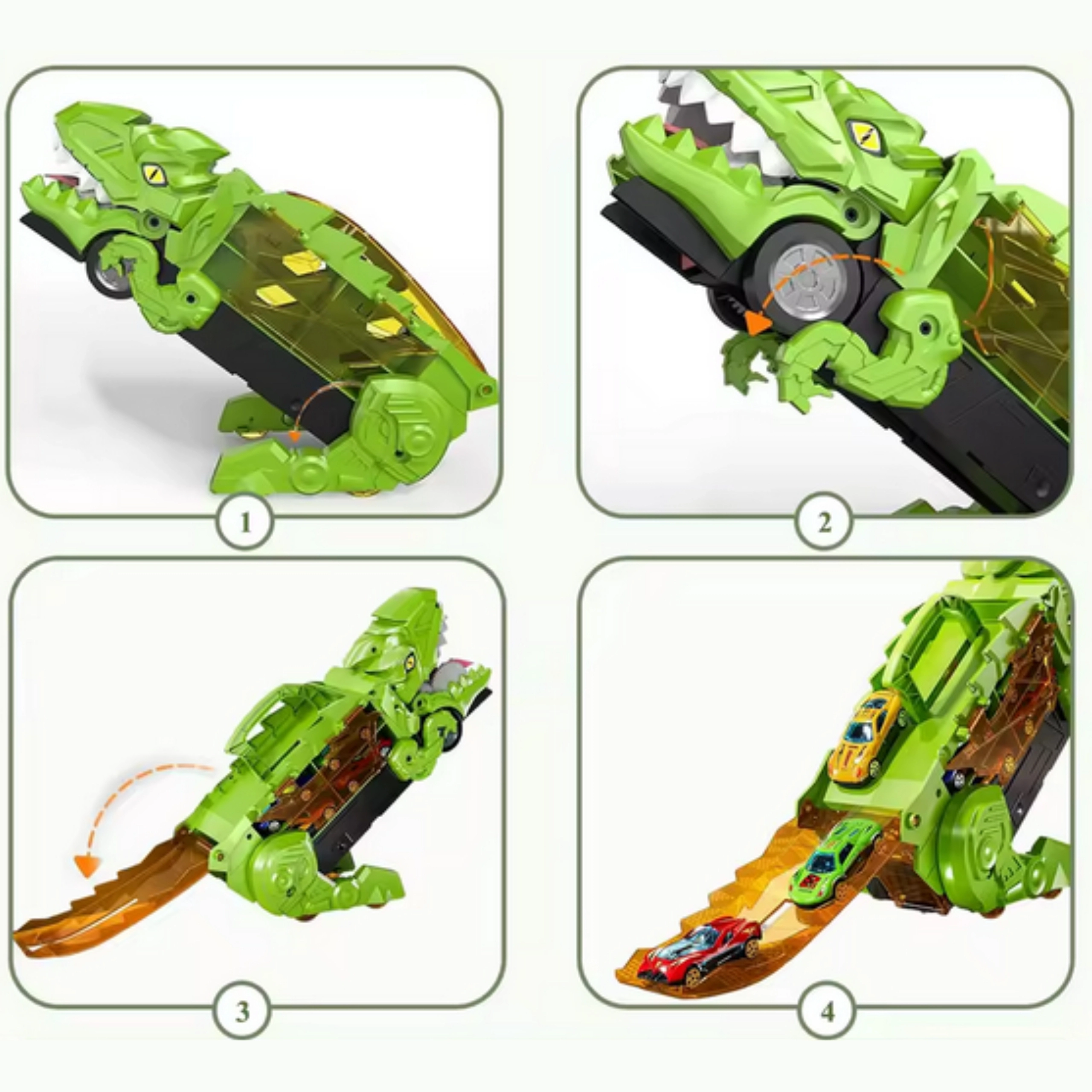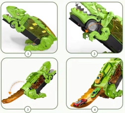 Atveriet dinozaura galvu un nolaidiet oranžo slidkalniņu. Mašīnītes vienmērīgi izbrauks ārā, un sacīkstes var sākties.