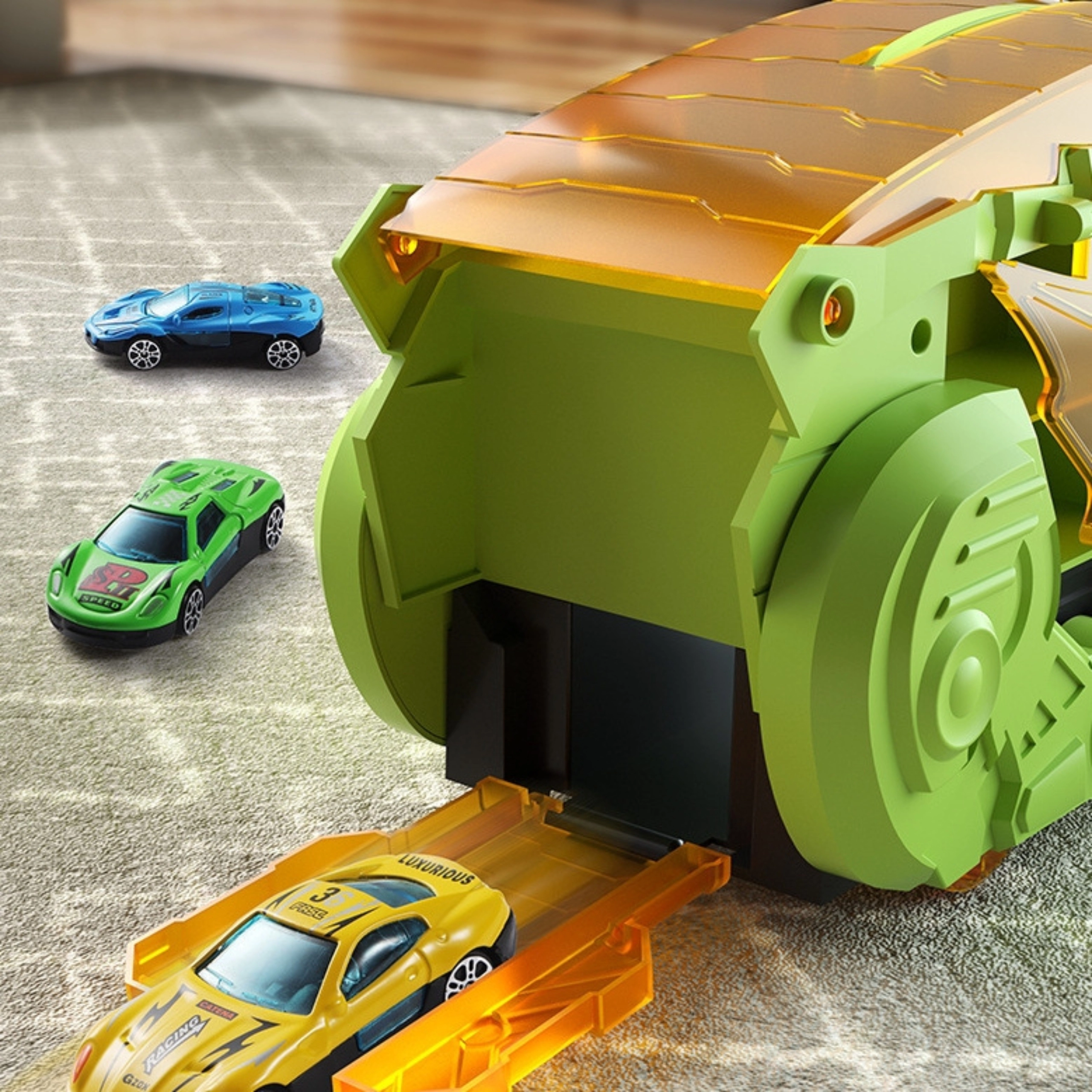 Dinozaura vilcējs acumirklī pārvēršas par dinamisku spēļu laukumu: izklājiet oranžo rampu, ielādējiet mašīnītes un ļaujiet tām izšaut no atvērtās dinozaura mutes. Pateicoties praktiskajam rokturim un iekšējiem nodalījumiem, visas mašīnas ir viegli salikt un paņemt līdzi. Spilgti toņi un izteiksmīgas detaļas veicina iztēli un aicina uz spēli.