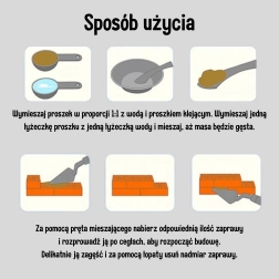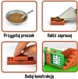 Lietošana ir vienkārša: sajauciet pulveri ar ūdeni 1:1, uzklājiet javu ar špakteļlāpstiņu un klājiet ķieģeļus kārtu pa kārtai. Pabeigto māju atkārtotai izmantošanai var iemērkt siltā ūdenī uz 1–3 stundām – java izšķīdīs un detaļas varēs izmantot no jauna. Iekļautie bērnu instrumenti māca pareizas kustības un attīsta sīko motoriku.