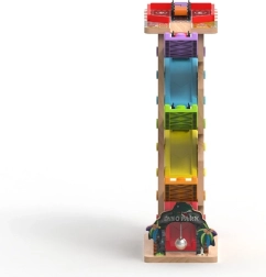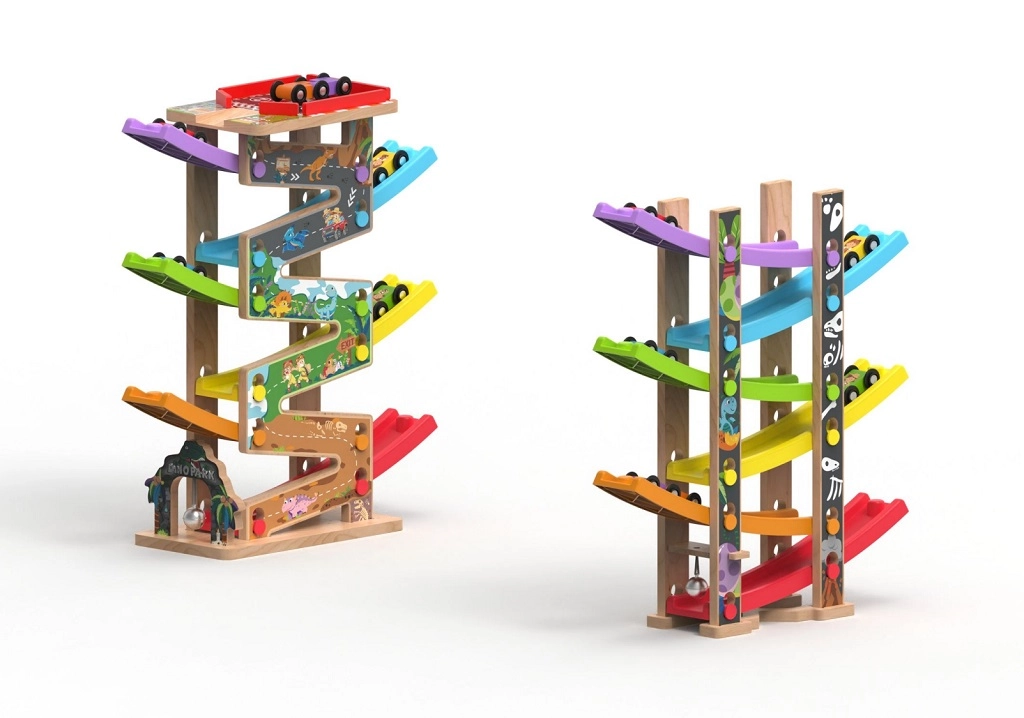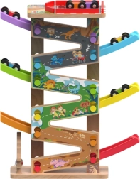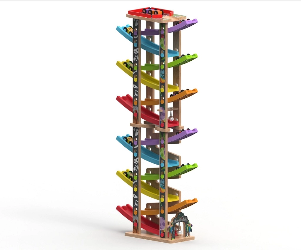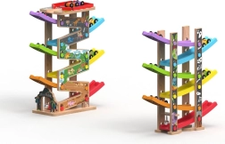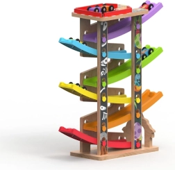 Šī vertikālā koka sacīkšu tornis ar 6 krāsainām rampām sniedz dinamisku spēli, kas balstīta uz gravitāciju. Bērni novieto mašīnīti augšā un vēro, kā tā traucas lejup pa dažādiem līmeņiem, pagriezieniem un tiltiņiem. Pateicoties stabilajai konstrukcijai un kompaktajiem izmēriem, trase ir piemērota gan bērnistabai, gan rotaļu telpai un iztur arī intensīvu lietošanu.