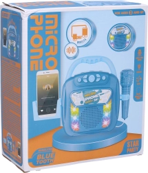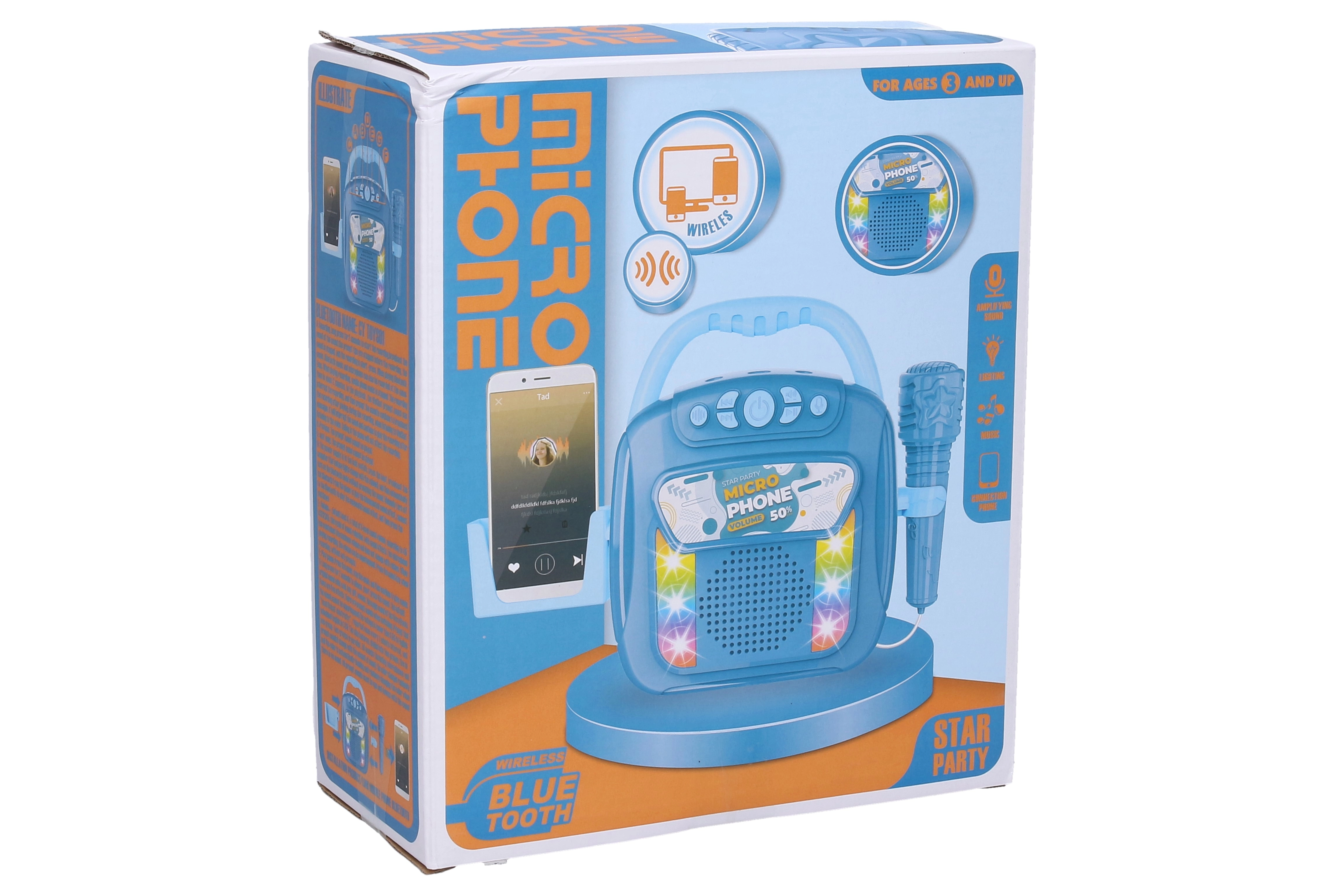 Pārnēsājams mūzikas bokss ar mikrofonu un bezvadu Bluetooth savienojumu iepriecinās gan bērnus, gan pieaugušos. Tas piedāvā gaismas efektus, iespēju ierakstīt, ērtu skaļuma regulēšanu un dziesmu pārslēgšanu. Iepakojumā iekļauts USB uzlādes kabelis, tālruņa turētājs un 3,7 V akumulatora bloks – viss gatavs tūlītējai lietošanai.