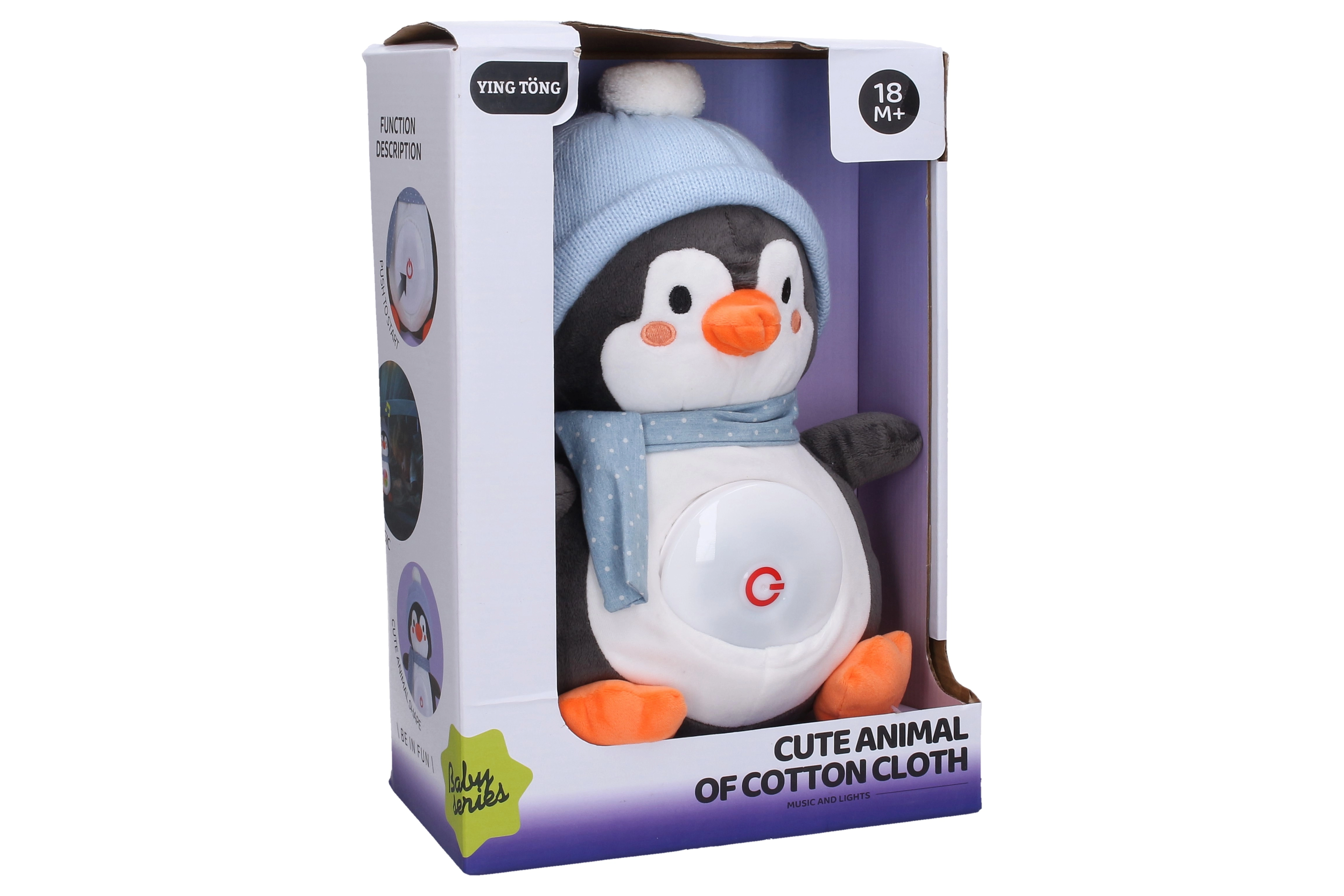 Šis mīkstais pingvīns rada patīkamu atmosfēru iemigšanai. Rotaļlietas vēderiņš atskaņošanas laikā plūdeni maina krāsas, radot bērniem drošības un miera sajūtu. Pateicoties pārskatāmai vadībai uz vēderiņa, jūs viegli ieslēgsiet un pārslēgsiet kādu no 5 melodijām.