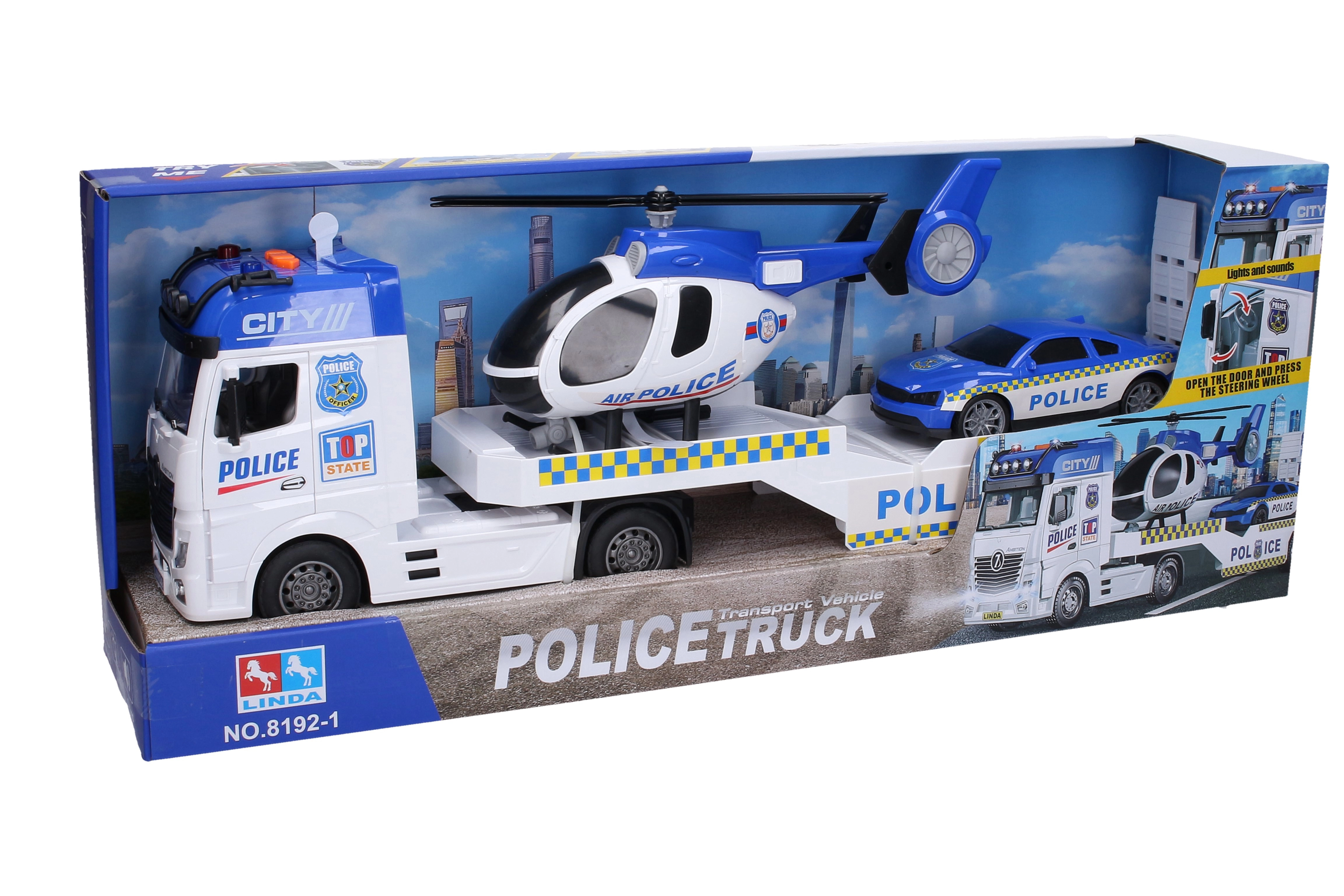 Dinamisks komplekts mazajiem glābējiem: policijas vilcējs 55 cm ar helikopteru 27 cm un policijas auto 16 cm sagādā daudz izklaides, pateicoties gaismas un skaņas efektiem. Vilcējam ir inerces piedziņa, efektus aktivizē ar pogām. Komplektā ir iekļautas baterijas, tāpēc bērni var spēlēties uzreiz pēc izpakošanas.
