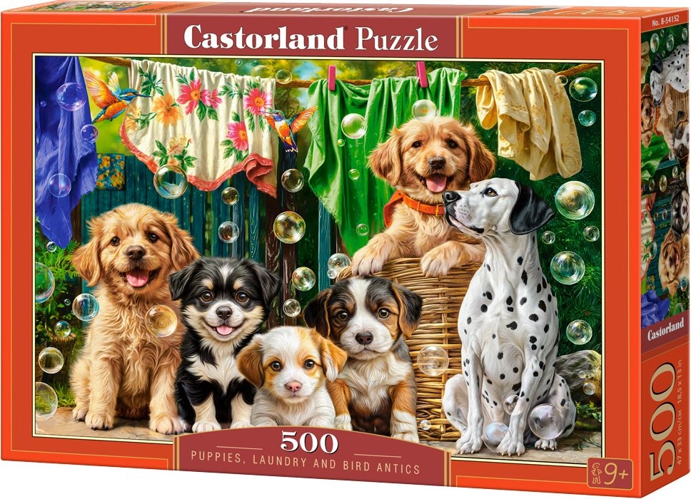 Atklājiet apburošu motīvu ar jautriem kucēniem pie veļas un putnu rotaļām. CASTORLAND zīmola puzles izceļas ar kvalitatīvu druku, daiļām, noturīgām krāsām un precīzu detaļu saderību, tāpēc likšana ir prieks no pirmā līdz pēdējam gabaliņam. Pēc salikšanas attēla izmērs ir aptuveni 47 × 33 cm – ideāls formāts ierāmēšanai vai izvietošanai.