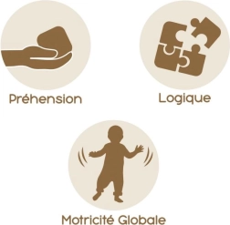 Bērniem patiks košie elementi: krellīšu labirints, griežamie zobrati, bumbiņu tornis un formu šķirotājs. Katra aktivitāte ir veidota, lai veicinātu motorikas attīstību, pacietību un cēloņu–seku izpratni.
