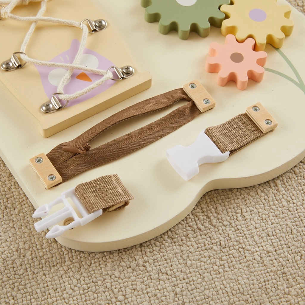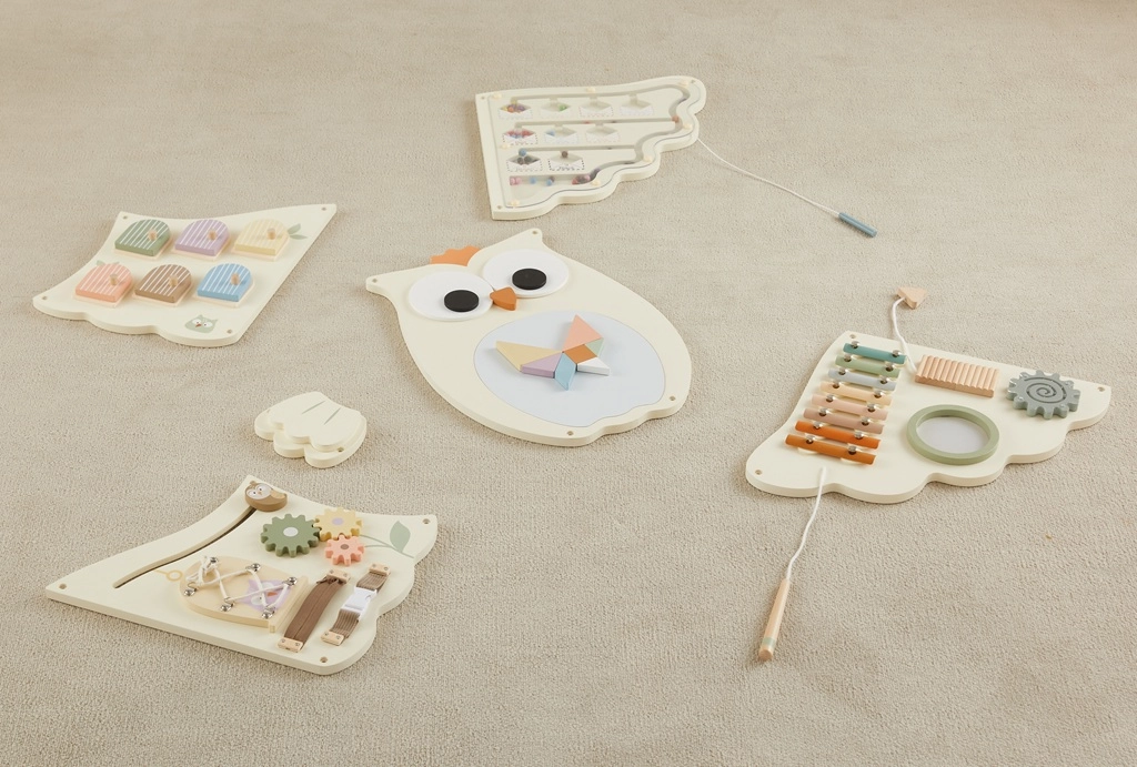 Ksilo fons, zobrati, labirints, bīdāmie un atveramie elementi, krelles un durtiņas ar pārsteigumu – viss motivē bērnus izzināt un attīsta sīko motoriku un loģiku.