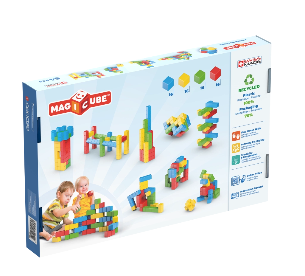 Atklājiet 3D veidošanu ar magnētiskajiem klucīšiem GEOMAG MAGICUBE. Pateicoties īpašajai iekšējai konstrukcijai, klucīši piesaistās no visām sešām pusēm, stingri turas arī brīvā telpā un nodrošina vienkāršu un drošu būvēšanu jau no 1 gada vecuma. Iepakojumā ir 64 klucīši četrās krāsās no 100% pārstrādātas plastmasas, ražoti Šveicē.