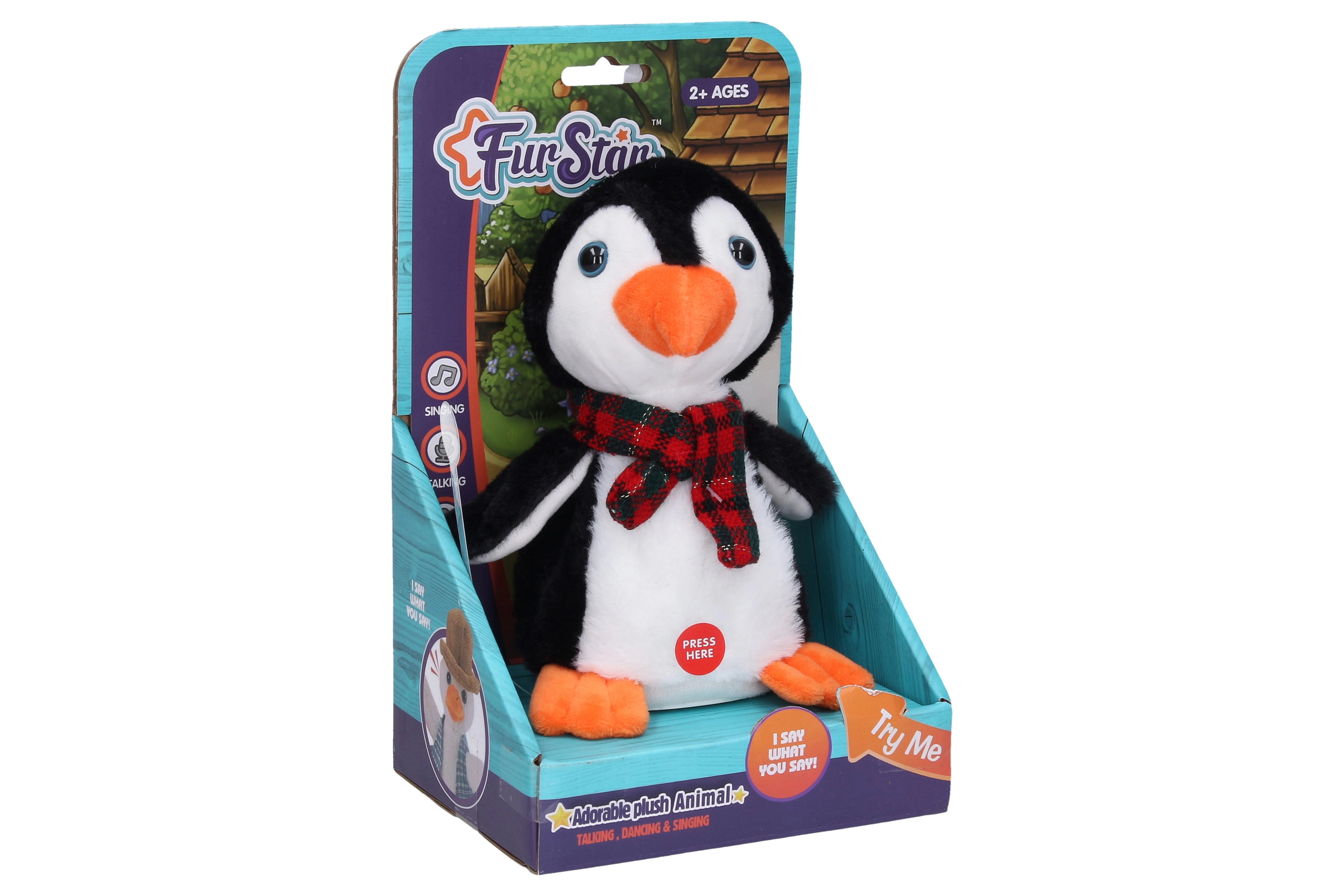 Mīlīgs interaktīvs pingvīns, kas atkārto, ko sakāt, un vienlaikus dejo un dzied. Piedāvā izklaidējošus skaņas efektus, vienkāršu vadību ar pogu uz vēdera un slēdzi OFF/TRY ME/PLAY. Ideāla dāvana bērniem, kuri mīl mūziku un smieklus.