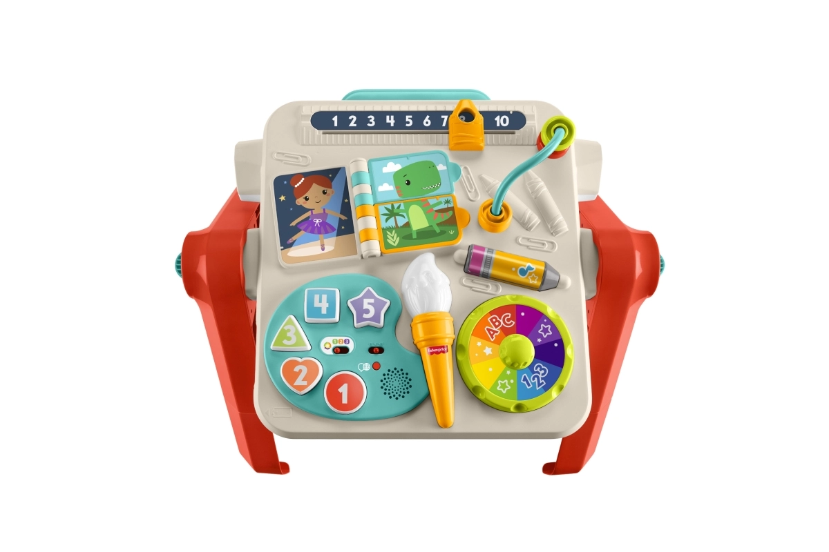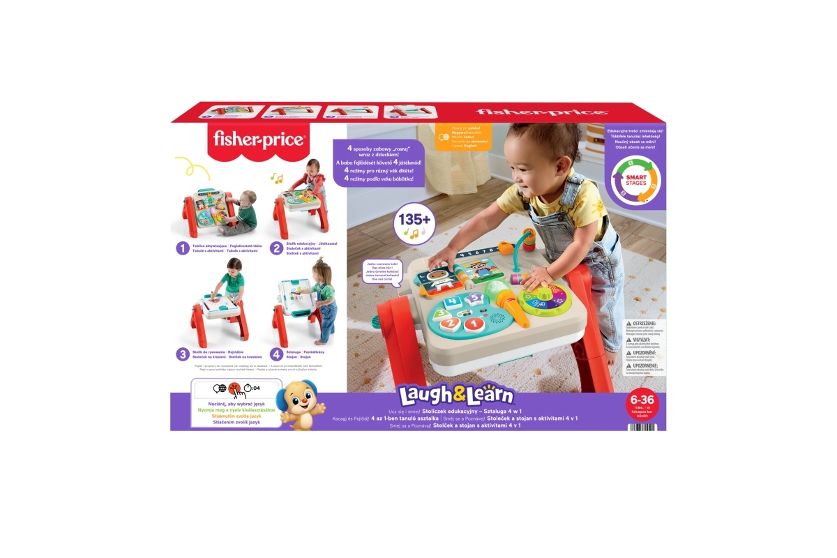 Interaktīvais FISHER-PRICE galdiņš 4 vienā sniedz gudru mācīšanos caur spēli ikvienā attīstības posmā. Bērnus aizraus “mākslinieka” paneļa mācības par skaitļiem, krāsām un formām, griežamais krāsainais ritenītis ar mūziku, grozāma grāmatiņa, krellīšu sliede un griezējs motorikas attīstībai. Smart Stages režīmus var viegli pielāgot bērna vecumam un prasmēm.