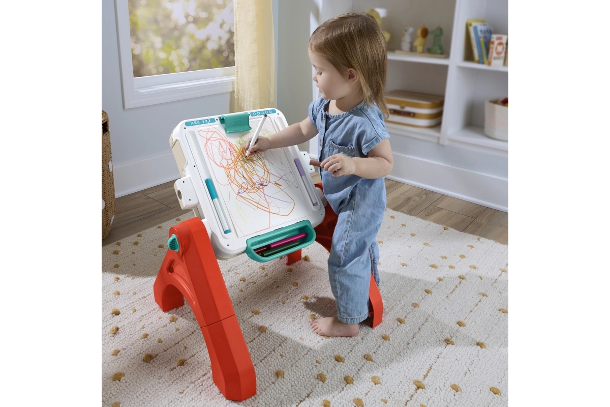 No sēdēšanas līdz stāvēšanai un patstāvīgai radošai darbošanās. Galdiņu var viegli pārveidot par atvērtu galdu vai stāvošu tāfeli mazajiem māksliniekiem.