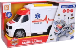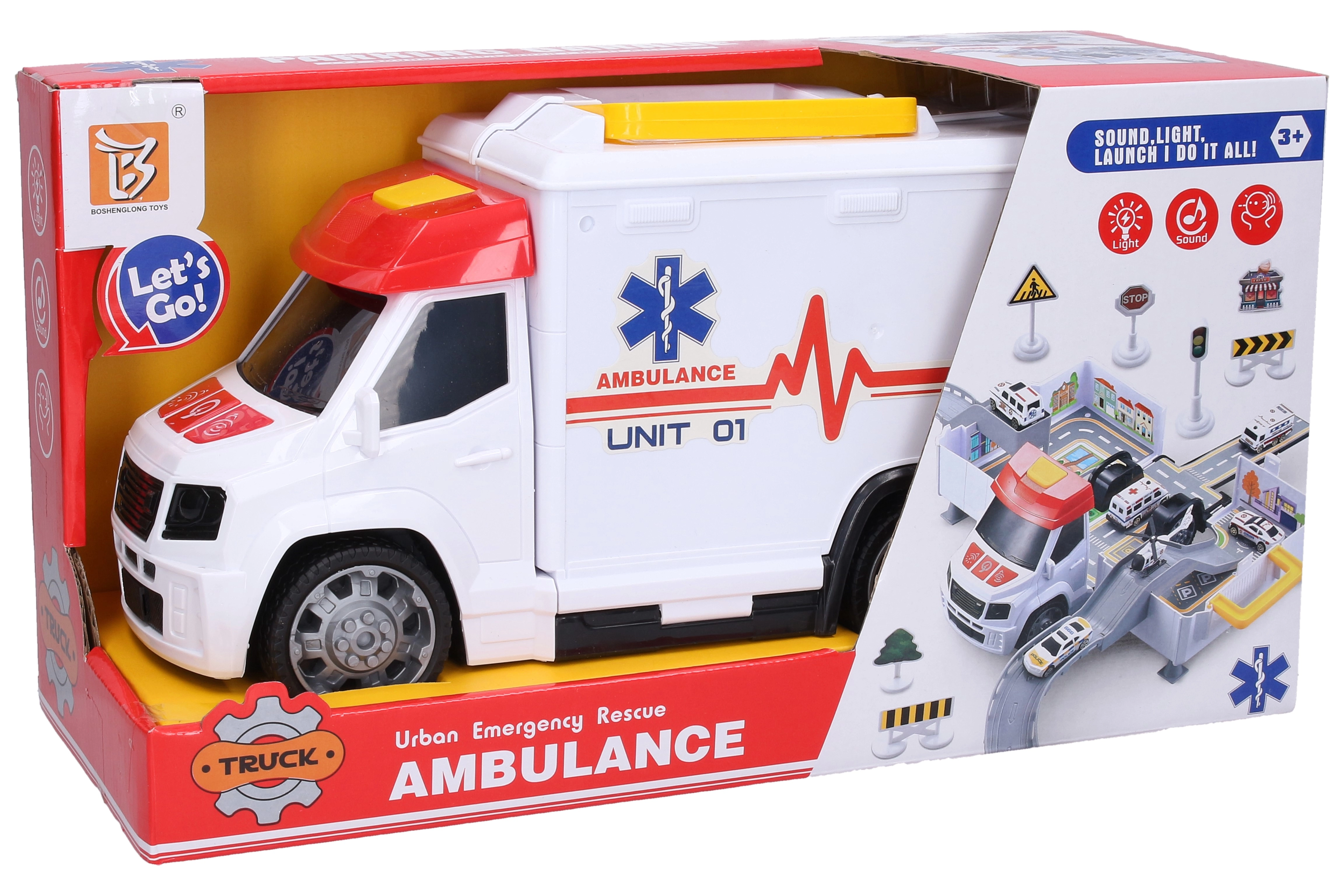 Izklaidējoša un reālistiska ātrā palīdzība ar salokāmu slimnīcas garāžu nodrošinās bērniem stundām ilgu spēli. Tā ir aprīkota ar gaismas un skaņas efektiem, aktivāciju ar pogām uz motora pārsega un lielo pogu uz jumta atbloķēšanai. Komplektā ietilpst barošana 3× AG13. Brīvgaitas riteņi nodrošina vienmērīgu braukšanu, bet pēc atvēršanas izveidojas slimnīcas spēļu komplekss ar mašīnītēm un ceļazīmēm.