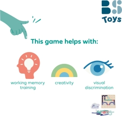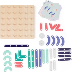 Komplektā ir izturīga koka pamatne un paraugu komplekti ar pakāpeniski pieaugošu grūtības pakāpi. Spēle ir ideāli piemērota gan mājas izklaidei, gan pirmsskolas attīstošām aktivitātēm – bērni rotaļīgi apgūst formas, krāsas un telpisko domāšanu.