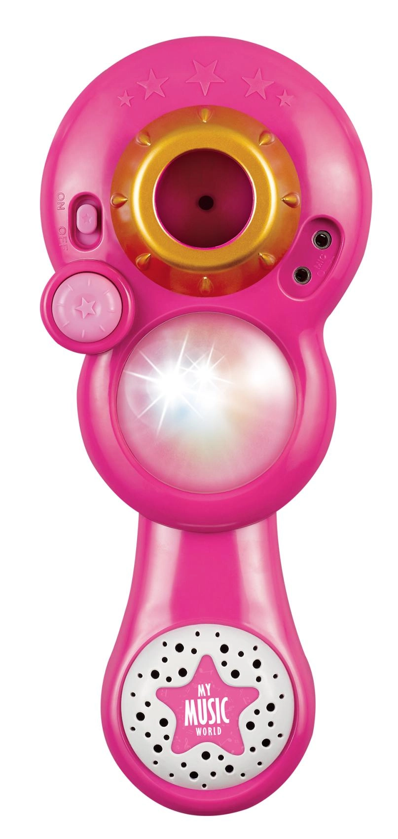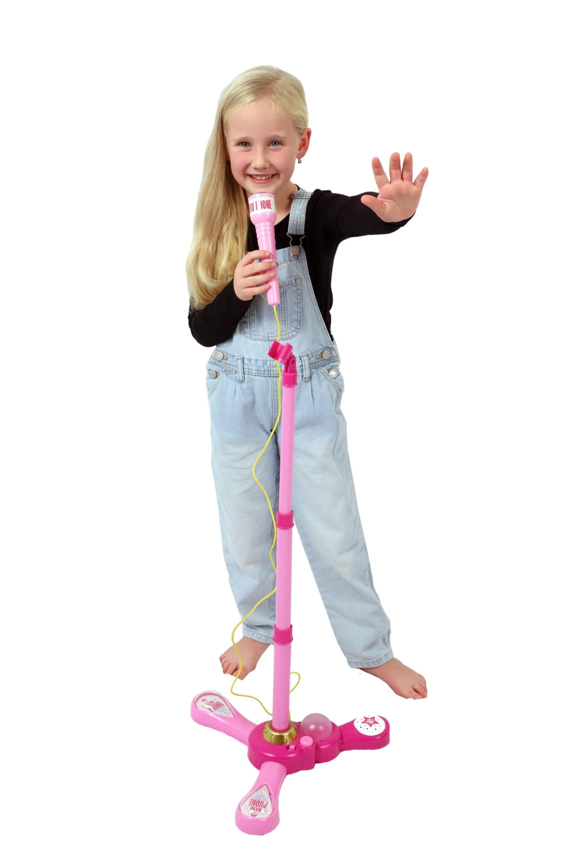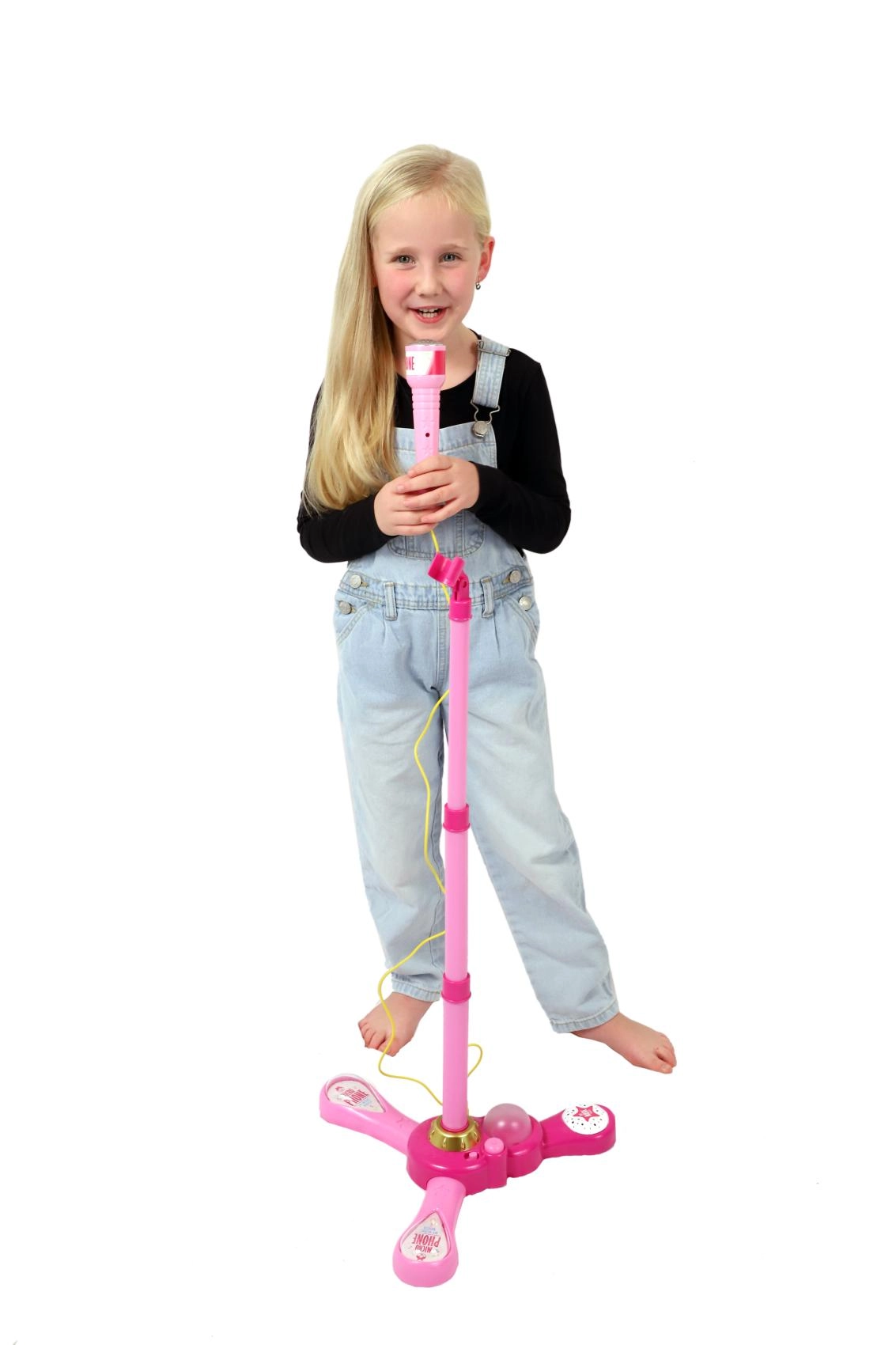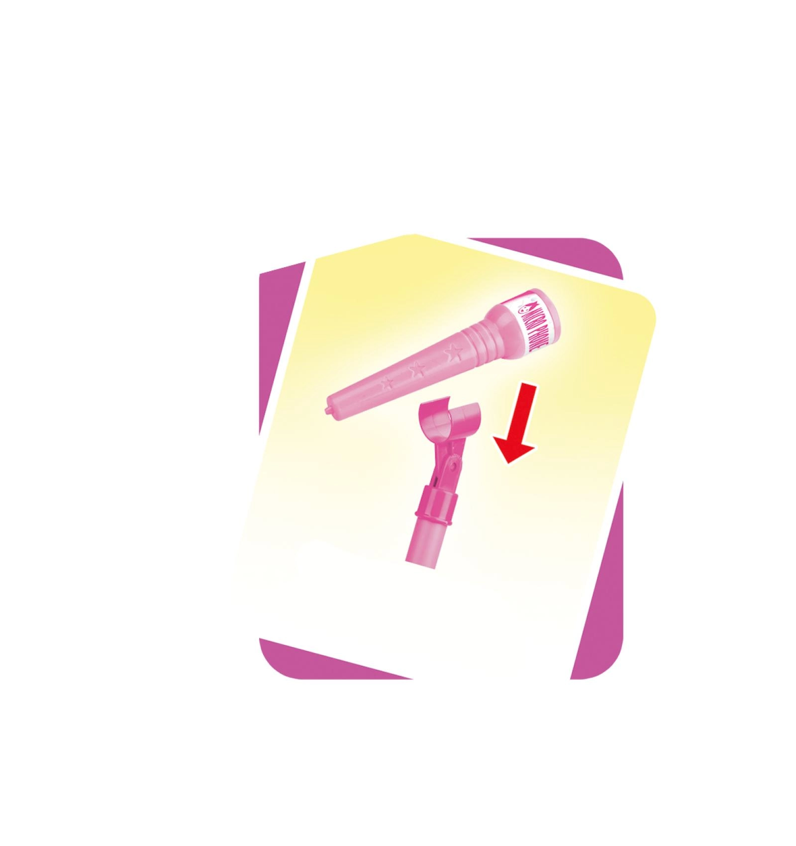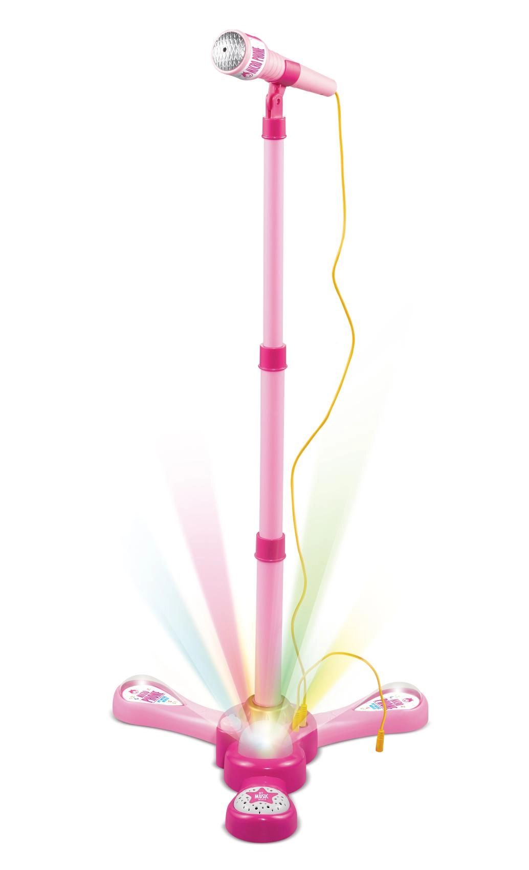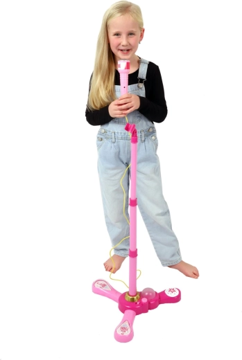 Rozā karaoke mikrofons uz statīva pārvērtīs jebkuru bērnu istabu par skatuvi. Tas piedāvā 12 iebūvētas dziesmas, krāsainus gaismas efektus un iespēju pievienot MP3 vai mobilo telefonu. Pateicoties regulējamam augstumam 40–80 cm, tas aug līdzi bērnam un ir ideāli piemērots mazajiem dziedātājiem no 3 gadu vecuma.