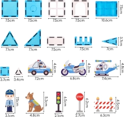 - Magnētiskie paneļi dažādās formās, policistu figūriņas, policijas suns, patruļmašīna, helikopters, motocikls, ceļa zīmes, barjeras, uzlīmes
