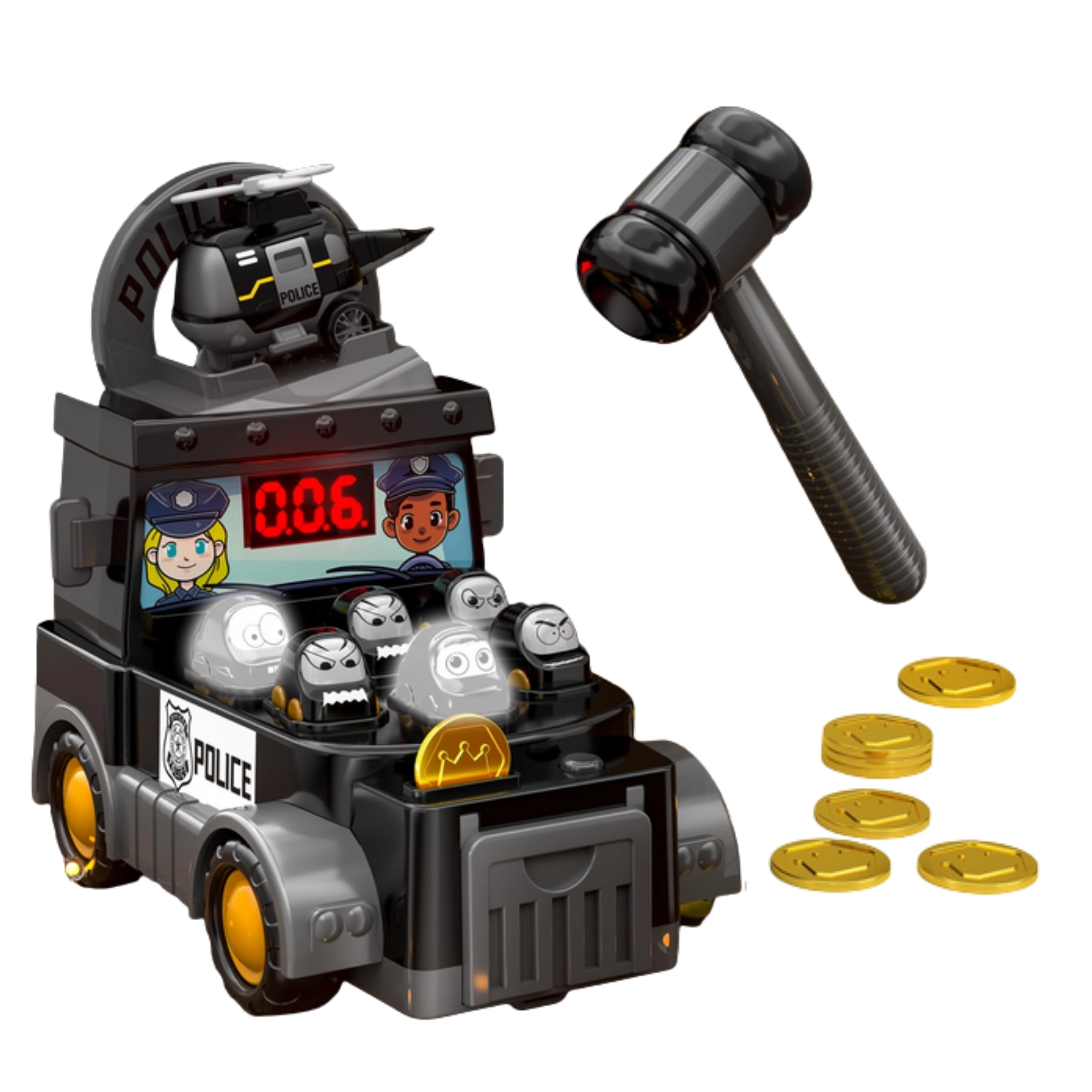 Policijas versija iecienītajai spēlei Sit kurmi sajūsminās bērnus no 3 gadu vecuma. Pietiek paņemt rokā mīkstu āmuriņu un trāpīt “blēžiem”, kas izlēc no atverēm radioautomašīnā. Pateicoties rezultātu displejam, bērni viegli seko savam sniegumam un var sacensties ar draugiem vai vecākiem.