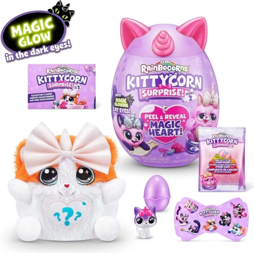 Atklājiet burvīgo RAINBOCORNS KITTYCORN SURPRISE pasauli – mīksts plīša kaķēns ar vienradža ragu un slepeniem aksesuāriem, kas paslēpti olā. Katra paciņa sniedz atvēršanas prieku, aksesuāru maiņu un radošu spēli. Lieliska dāvana bērniem no 3 gadu vecuma un kolekcionējama kolekcija ar 7 dažādiem mīluļiem.