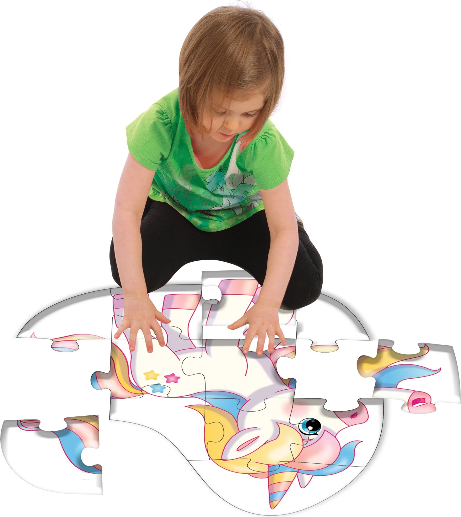 Šī kontūru puzle vienradža formā iepriecinās visus mazos pasaku mīļotājus. Saliktā attēla izmērs ir aptuveni 53 × 55 cm, tāpēc tas ir labi pārskatāms, skaidrs un lieliski piemērots salikšanai uz grīdas. Lielākos gabalus ir ērti turēt pat mazākām bērnu rociņām.