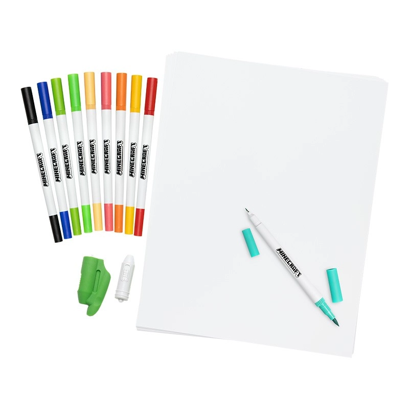 Komplektā ir viegli, divpusēji marķieri ar smalku un platāku uzgali precīzām līnijām un plūdenai tonēšanai. Ideāli skicēm, pārvelkšanai un Minecraft motīvu iekrāsošanai.