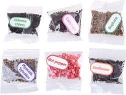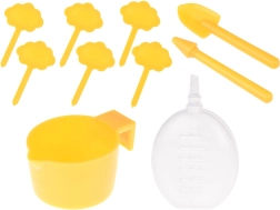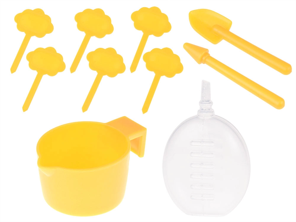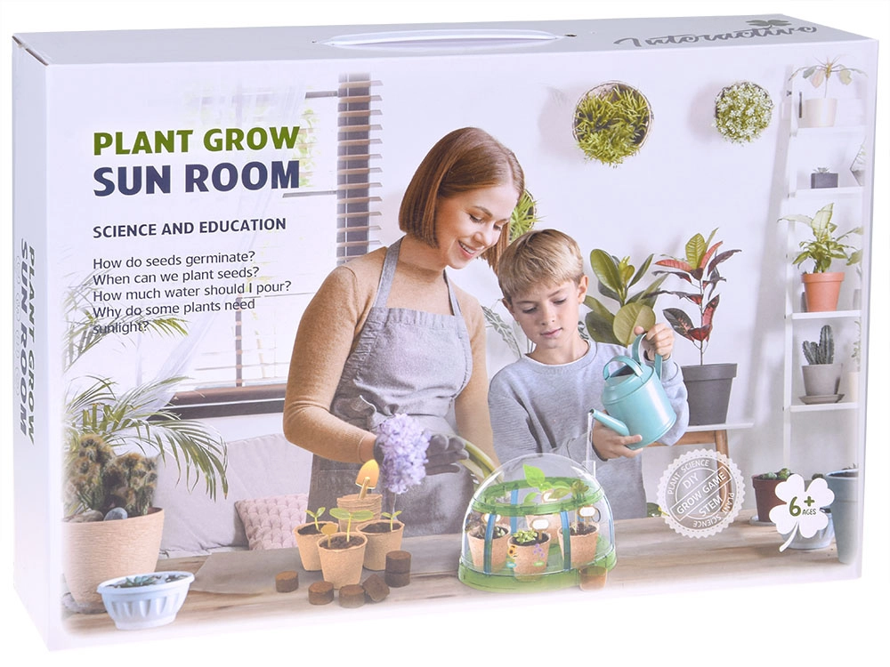 - 1× mini siltumnīca, 6× bioloģiski noārdāms podiņš, 6× kokosriekstu brikete (Ø 30 mm), 6× augu marķēšanas etiķete, 1× lāpstiņa, 1× sēšanas irbulis, 1× laistīšanas trauciņš, 1× uzlīmju komplekts (ar augu nosaukumiem un attēliem), 1× uzlīmju komplekts ar augu nosaukumiem (angļu valodā), 6× sēklu paciņa (balzaminis, saulespuķe, ziemciete, lociņi, neļķe, paprika), attēlu pamācība