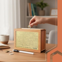 Stilīga krātuve no dabīga koka brūni‑bēšā tonī piedāvā skaidru uzkrājuma mērķi un ikdienas motivāciju. Ar 5 maināmām kartītēm ar dažādām vērtībām jūs viegli iestatīsiet savu izaicinājumu un pakāpeniski krāsosiet/atzīmēsiet atsevišķos laukumus līdz pilnīgai izpildei.