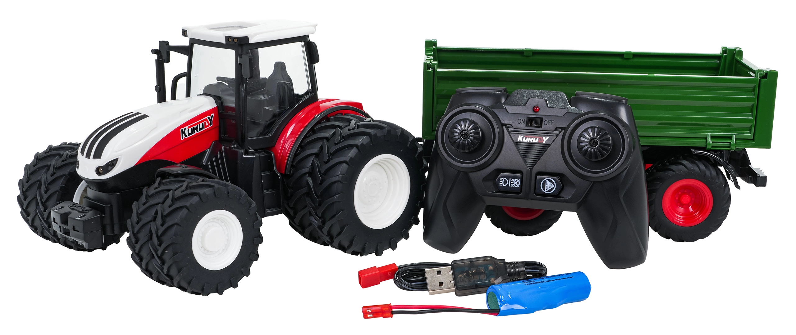 - traktors ar piekabi, 2,4 GHz pults, 3,7 V akumulators, USB uzlādes kabelis