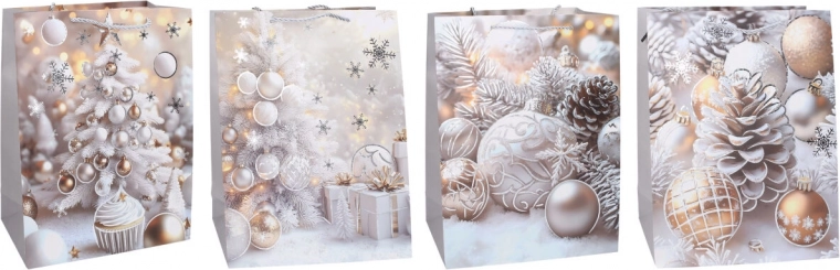 Stilīgs Ziemassvētku dāvanu maisiņš S izmērā ar izmēriem 18 × 24 × 8,5 cm ir ideāls mazākām dāvanām. Pieejami 4 pievilcīgi motīvi, izturīga izgatavošana un elegants izskats skaistai svētku iesaiņošanai.