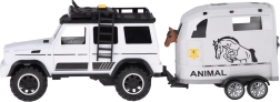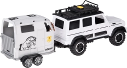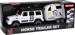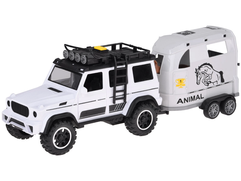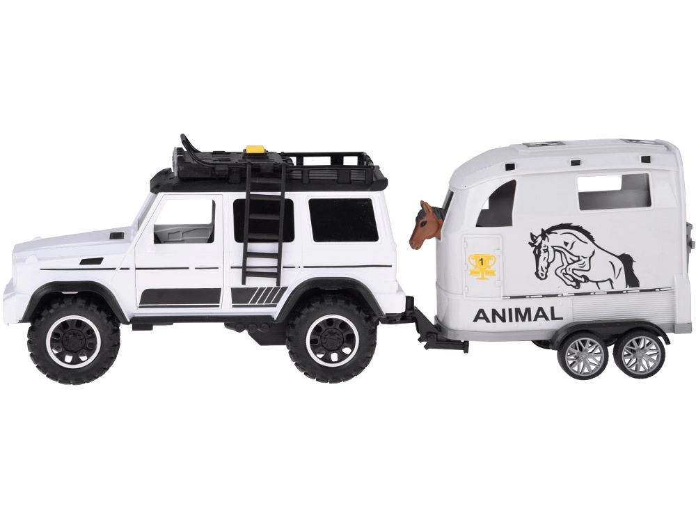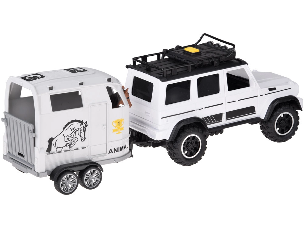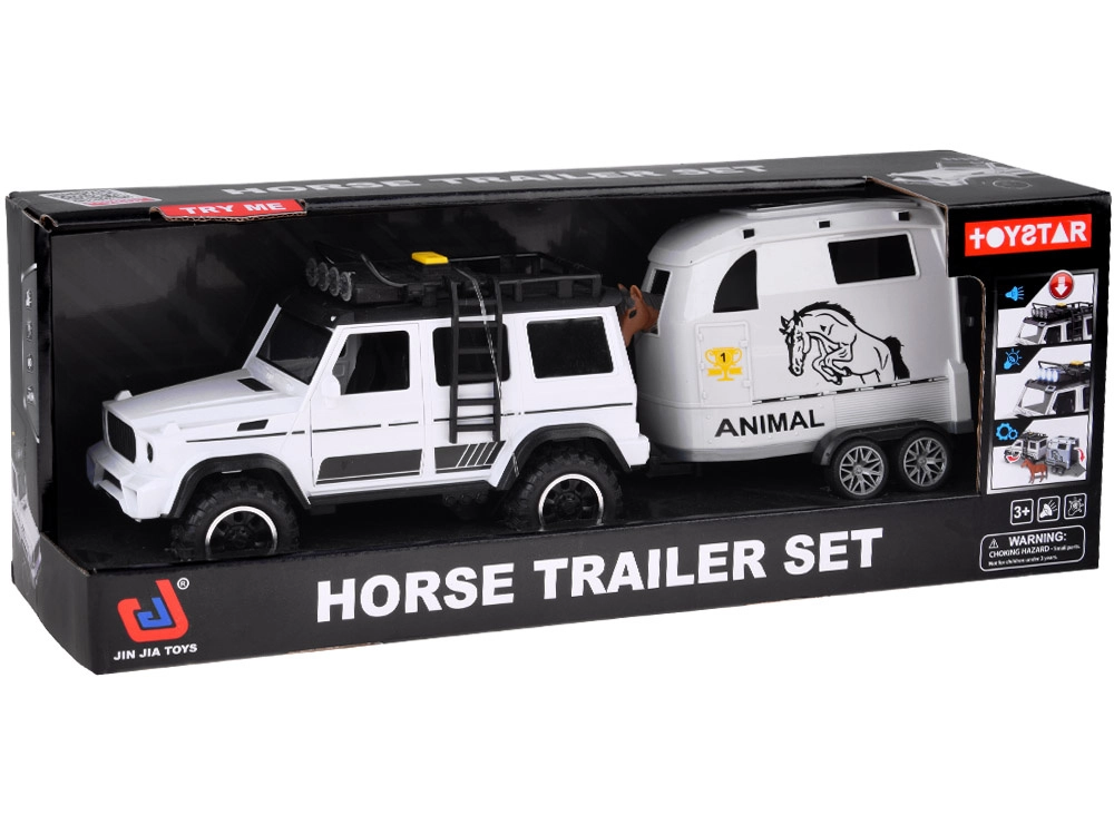Šis detalizēti izstrādātais komplekts apvieno izturīgu apvidus transportlīdzekli un kūts tipa piekabi, kas paredzēta drošai zirgu pārvadāšanai. Bērni izbaudīs reālistiskas detaļas, piemēram, jumta bagāžnieku ar kāpnēm, atveramas priekšējās durvis un lielus apvidus riteņus, kas spēj tikt galā ar jebkuru piedzīvojumu bērnistabā.