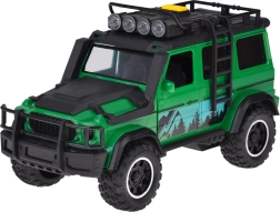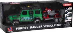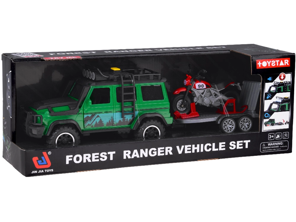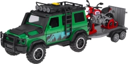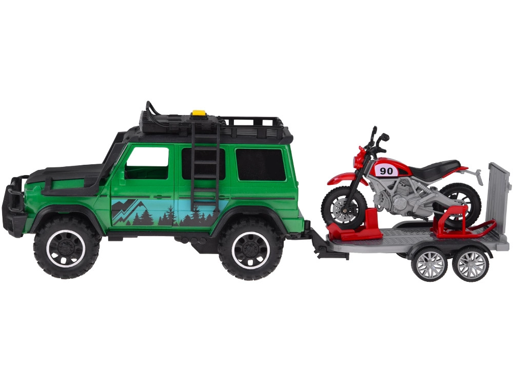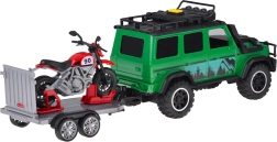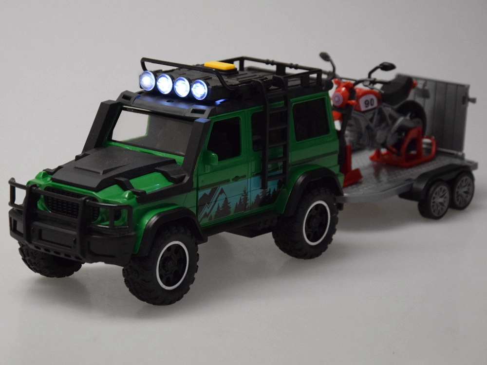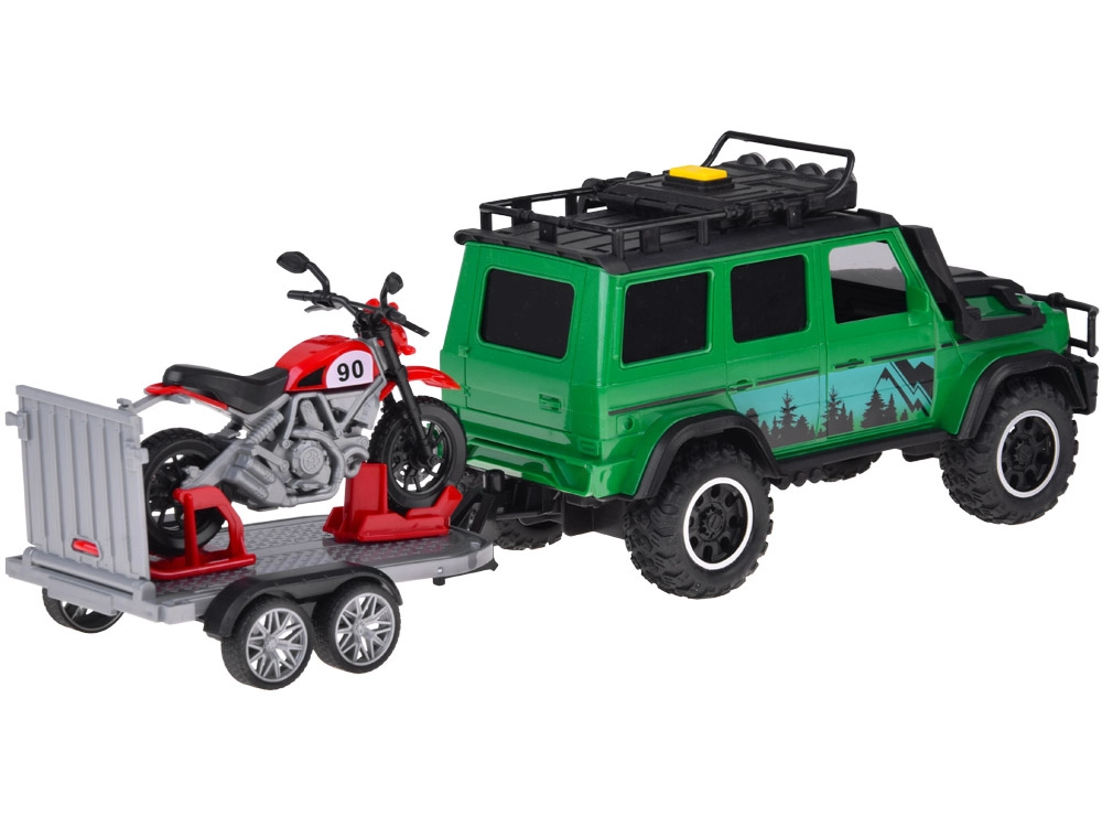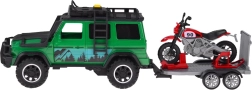 Piedzīvojumu komplekts mazajiem vadītājiem: zaļš apvidus auto ar atvienojamu piekabi–platformu un sarkanu sporta motociklu. Auto piedāvā gaismas un skaņas efektus, atveramas durvis un gumijas riteņus vienmērīgai braukšanai. Piekabei ir nolaižama aizmugurējā rampa ērtai iekraušanai un drošai motocikla pārvadāšanai. Ideāli piemērots radošai spēlei un citu iemīļotu rotaļlietu pārvadāšanai.